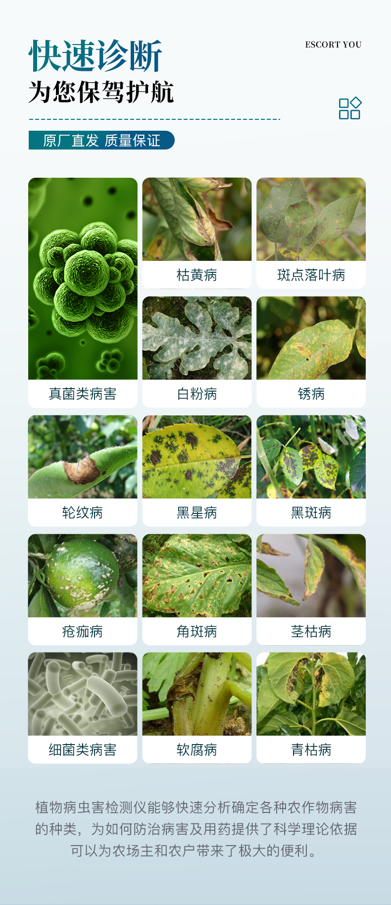 簡介:植物病蟲害檢測設備簡介:細菌、真菌和病毒是引起蔬菜、水果、小麥,玉米、水稻、大豆等農作物及林木,花卉等病害的主要原因。這些病害微生物一般通過莖、葉、根系、果實等侵染植 物,大部分病害在染病初期雖能較易防治,但一般不易被人察覺,病害一量發生,防治不僅困難而且效果較差,致使農作物減產,甚至絕收。如何在病害