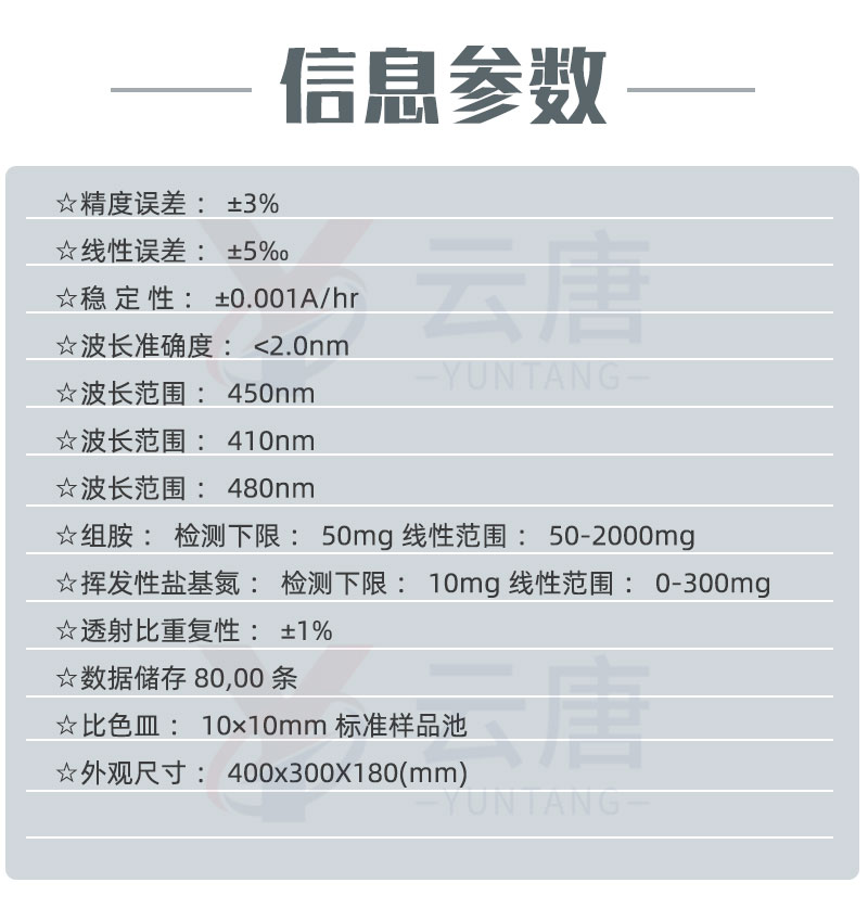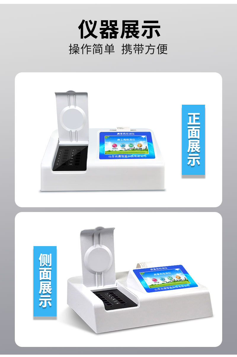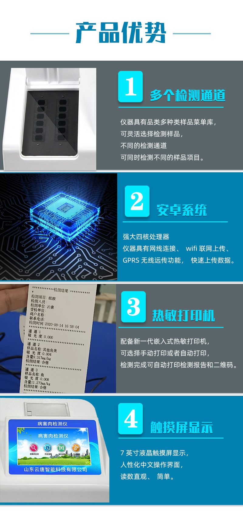 山東云唐智能科技有限公司生產(chǎn)的病害肉檢測(cè)儀為集成化食品安全快速檢測(cè)分析設(shè)備,采用臺(tái)式一體化設(shè)計(jì),可對(duì)豬肉、牛肉、羊肉、魚(yú)類(lèi)等存在的病害肉組胺、揮發(fā)性鹽基氮進(jìn)行快速定量檢測(cè),儀器預(yù)留其他項(xiàng)目檢測(cè)程序和端口,根據(jù)日后需求可進(jìn)行遠(yuǎn)程升級(jí)