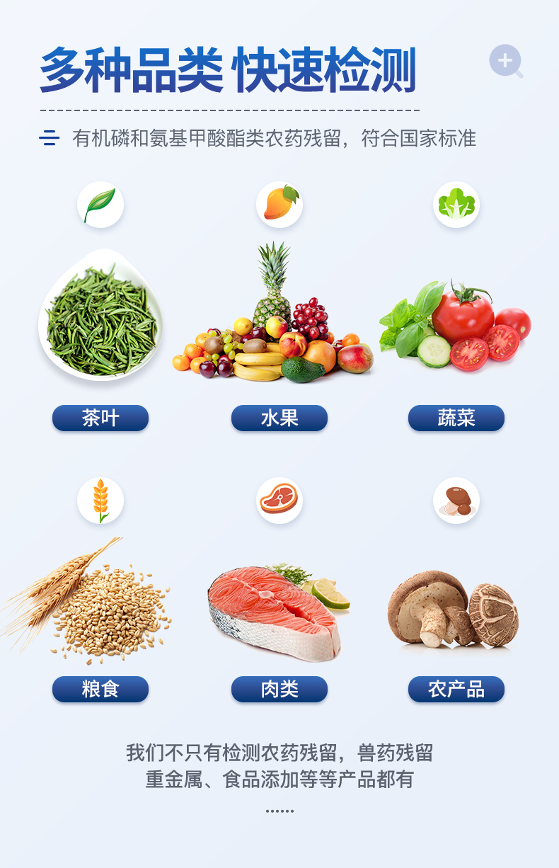 廣泛應用于主要用于蔬菜、水果、茶葉、糧食、農副產品等食品中有機磷和氨基甲酸酯類農藥殘留的快速檢測;此外還可用于果蔬茶生產基地和農貿批發銷售市場現場檢測,餐館、學校、食堂、家庭果蔬加工前的安全速測等。