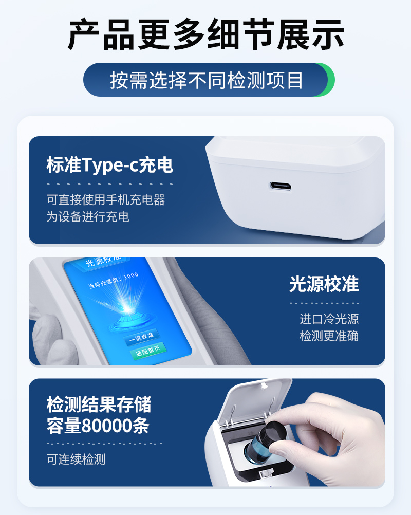 6. 可保存標準曲線80條及1800個測定值(日期、時間、參數、檢測數據)。