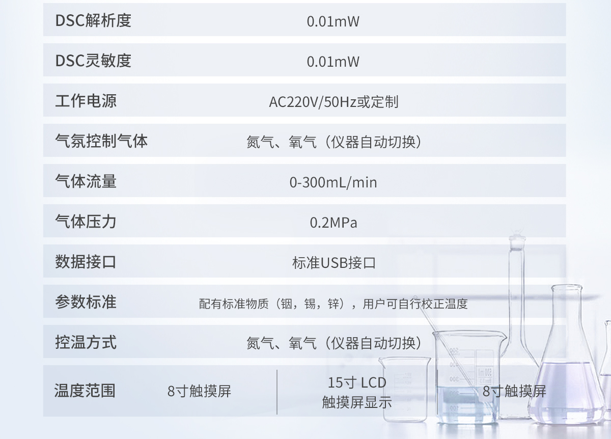 1.溫度范圍: 室溫~500℃ 2.溫度分辨率: 0.01℃ 3.溫度波動: ±0.1℃ 4.溫度重復性: ±0.1℃ 5.升溫速率: 0.1~100℃/min 6.恒溫時間:建議<24h 7.控溫方式:升溫,恒溫(全自動程序控制) 8.DSC量程: 0~±600mW 9.DSC解析度: 0.01mW 10.DSC靈敏度: 0.01mW 11.工作電源: AC220V/50Hz或定制 12. 氣氛控制氣體:氮氣、氧氣(儀器自動切換) 13.氣體流量:0-300mL/min 14.氣體壓力:0.2MPa 15.顯示方式: 15寸 LCD觸摸屏顯示 16.數據接口:標準USB接口 17.參數標準: 配有標準物質(銦,錫,鋅),用戶可自行校正溫度 18.常規款是自然降溫