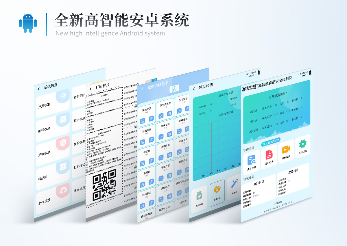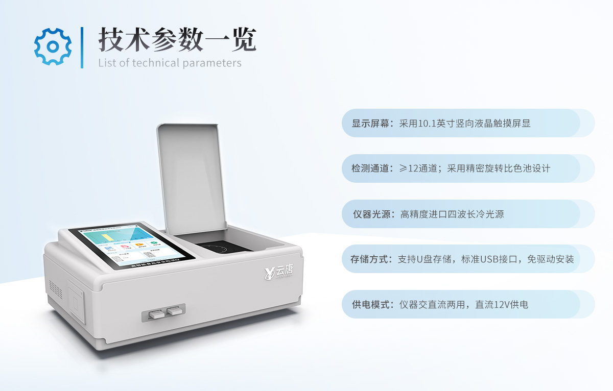 | 儀器采用手提式一體化系統(tǒng)檢測技術(shù),將分光光度模塊、數(shù)字化管理模塊、無線通訊模塊高度集成于一體,支持檢測200種食品安全檢測項目,同時預(yù)留升級檢測方法。 | 儀器檢測模塊標(biāo)準(zhǔn)化、智能化,檢測項目可隨意自由組合。檢測箱體內(nèi)置多個標(biāo)準(zhǔn)檢測單元,檢測模塊可以調(diào)整配置。 | 顯示屏幕:儀器采用10.1英寸豎向液晶觸摸屏顯,搭配運行安卓智能操作系統(tǒng),主控芯片采用ARM Cortex-A7,RK3288/4核處理器,主頻1.88Ghz,操作方便,性能更強。 | 檢測通道:≥12通道;采用精密旋轉(zhuǎn)比色池設(shè)計,使用同芯片同光源校準(zhǔn)精度,解決不同光源之間的誤差值,更加準(zhǔn)確**。(1-12通道間誤差0.1%,**號:**202022821055.2) | 儀器光源:高精度進口四波長冷光源,每個通道均配置 410、520、590、630nm 波長光源,標(biāo)配**的光路切換裝置,**光路切換功能可實現(xiàn)64波長,并且所有檢測項目可實現(xiàn)所有通道同時檢測。 | 設(shè)備可一鍵校準(zhǔn),自動保存校準(zhǔn)數(shù)據(jù),自動對比校驗,得到精準(zhǔn)光源,采用Android SP存儲數(shù)據(jù),光源數(shù)據(jù)永不丟失,方便每一次使用。 | 通訊接口:配備無線通信模塊、4G(APN)通訊模塊、藍牙傳輸,同時具有雙USB接口以及RJ45網(wǎng)線接口,可以多方式實現(xiàn)數(shù)據(jù)保存及數(shù)據(jù)傳輸。 | 存儲方式:支持U盤存儲,標(biāo)準(zhǔn)USB接口,免驅(qū)動安裝。檢測結(jié)果存儲容量20萬條以上,可生成Excel表格進行拷貝,并具有登錄保護功能。 | 智能化操作系統(tǒng): | 1)操作系統(tǒng):儀器可在同一檢測界面自動對應(yīng)相關(guān)檢測通道,一次性選擇1-12個樣品名稱,無需退出界面,節(jié)省操作時間。并可以對每個通道屬性和樣品信息單獨進行編輯,例如送檢單位、人員,檢測人員等,打印時勾選打印顯示。 | 2)數(shù)據(jù)集成系統(tǒng):設(shè)備首頁自動匯總分析檢測數(shù)據(jù),包含:周檢測數(shù)據(jù)、月檢測數(shù)據(jù),全部檢測總數(shù)量,均包含檢測總數(shù),合格數(shù),不合格數(shù),以及相關(guān)柱形分析圖,各項檢測數(shù)據(jù)一目了然,無需電腦查詢,更加快捷直觀。 | 3)數(shù)據(jù)庫系統(tǒng):十幾項數(shù)據(jù)庫分類管理儀器:包含項目類型、項目數(shù)據(jù)、檢測數(shù)據(jù)、歷史記錄、國標(biāo)信息、曲線信息、采樣信息、檢測信息、受檢信息、復(fù)核信息、圖表信息、光源校準(zhǔn)信息、打印樣式信息、樣品庫信息等等,數(shù)據(jù)庫之間互相協(xié)調(diào)聯(lián)動保證數(shù)據(jù)的真實完整性。同時產(chǎn)品數(shù)據(jù)庫以及歷史檢測記錄支持一鍵檢索功能。 | 4)限量規(guī)判系統(tǒng):具有限量查詢、添加物質(zhì)合規(guī)判定系統(tǒng)。檢測出結(jié)果后,系統(tǒng)自動調(diào)用系統(tǒng)數(shù)據(jù)庫中相關(guān)國標(biāo)進行比對判定,客觀顯示判定結(jié)果是否合格。 | 5)項目預(yù)設(shè)系統(tǒng):儀器具有任務(wù)預(yù)設(shè)模塊,一鍵提前預(yù)設(shè),給出方便快捷的新檢測方案,每一個任務(wù)分別可以設(shè)置不同的樣品、批次、編號、來源、備注、抽樣信息、檢測信息、受檢信息、復(fù)核信息等更多信息。樣品送檢時一鍵調(diào)取保存信息,并可多次調(diào)取,大大提高檢測效率。 | 6)數(shù)據(jù)監(jiān)管系統(tǒng):同步對接監(jiān)管平臺,數(shù)據(jù)可局域網(wǎng)和互聯(lián)網(wǎng)數(shù)據(jù)上傳,檢測結(jié)果可選擇直接傳至食品安全監(jiān)管平臺。進行區(qū)域食品安全監(jiān)管及大數(shù)據(jù)分析處理與數(shù)據(jù)統(tǒng)計,檢測區(qū)域食品安全長短期動態(tài),達到食品安全問題預(yù)估、預(yù)警。 | 7)打印系統(tǒng):內(nèi)置全新打印機,新創(chuàng)自定義打印方式,可按需靈活勾選控制:產(chǎn)品合格證(國家農(nóng)業(yè)部標(biāo)準(zhǔn)要求),二維碼,抽樣信息、檢測信息,受檢信息、復(fù)核信息、抽樣日期、檢測日期等信息的打印。 | 供電模式:儀器交直流兩用,直流12V供電,可連接車載電源,可配6ah大容量充電鋰電池,電量可實時顯示,方便戶外流動測試。 | 儀器加入遠程升級功能,可定向分客戶分儀器更新,開機后自動更新,客戶無需任何操作,即可升級全新項目。做到了無需退換機器即可實現(xiàn)實時遠程升級檢測儀器。 |