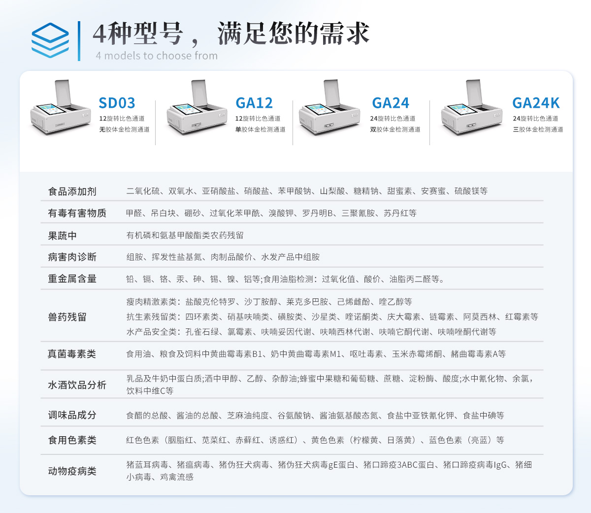 | 食品添加劑:二氧化硫、雙氧水、亞硝酸鹽、硝酸鹽、苯甲酸鈉、山梨酸鉀、糖精鈉、甜蜜素、木耳硫酸鎂等 | 有毒有害物質(zhì):甲醛、吊白塊、硼砂、過氧化苯甲酰、溴酸鉀、羅丹明B、三聚氰胺、蘇丹紅、工業(yè)堿、尿素、明礬等 | 食用油脂:過氧化值、酸價等 | 果蔬:農(nóng)藥殘留(酶抑制率法) | 病害肉:組胺、揮發(fā)性鹽基氮 | 重金屬含量:鉛、鎘、鉻、汞、砷、錫、鎳、鋁等 | 水酒飲品分析:酒中甲醇、乙醇、乳品及牛奶中蛋白質(zhì), | 蜂蜜成分:果糖和葡萄糖、蔗糖、淀粉酶、酸度等 | 調(diào)味品成分:食醋的總酸、醬油的總酸、芝麻油純度、谷氨酸鈉、醬油氨基酸態(tài)氮、食鹽中亞鐵氰化鉀、食鹽中碘等 | 食用色素類:紅色色素(胭脂紅、莧菜紅、莧菜紅)、黃色色素(檸檬黃、日落黃)、藍色色素(亮藍)等 |