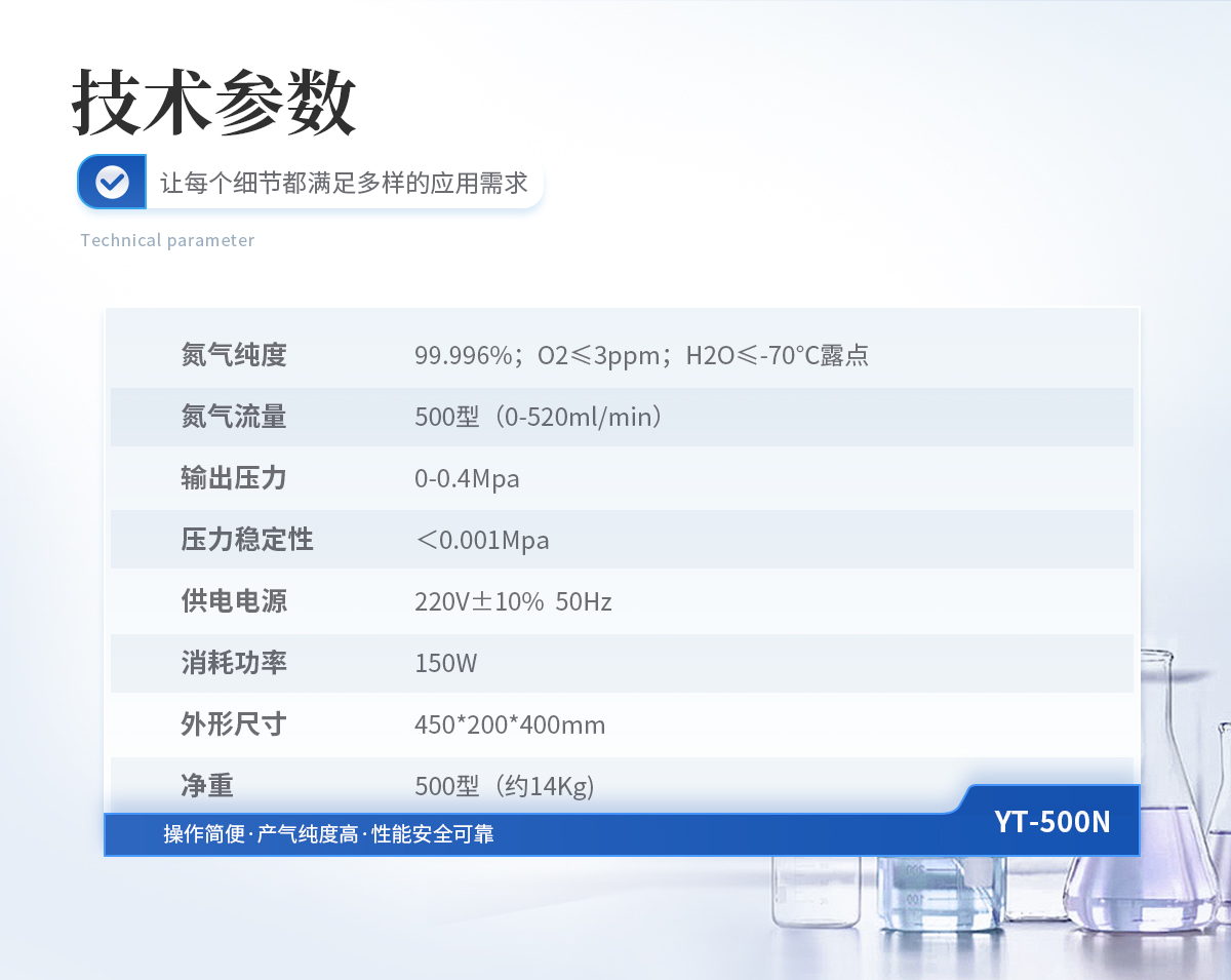| 1、氮氣純度: 99.996%;O2≤3ppm;H2O≤-70℃露點 | 2、氮氣流量: 500型(0-520ml/min) | 3、輸出壓力: 0-0.4Mpa | 4、壓力穩(wěn)定性:<0.001Mpa | 5、供電電源: 220V±10% 50Hz | 6、消耗功率: 150W | 7、外形尺寸: 450*200*400mm | 8、凈重: 500型(約14Kg) |