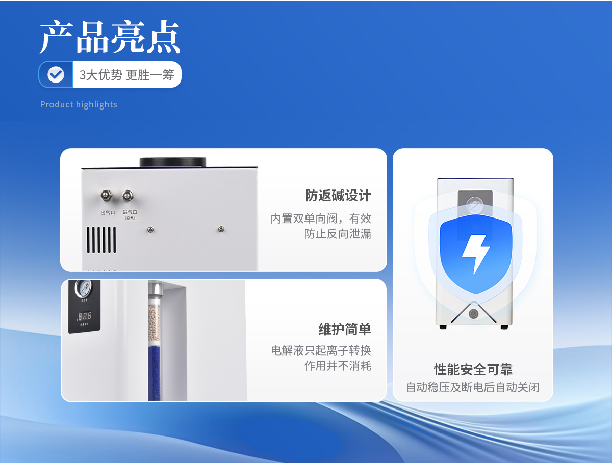 | 1、可取代高壓氮氣瓶,使實驗室儀器化。 | 2、操作簡便,只需啟動電源開關,儀器即可產(chǎn)氮且輸出壓力穩(wěn)定。 | 3、不消耗電解液;電解液只起離子轉換作用并不消耗,所以只需補充因蒸發(fā)而損失的少量蒸餾水。 | 4、產(chǎn)氣純度高,空氣經(jīng)電解池分離后即可得到高純氮氣。 | 5、性能安全可靠:具有穩(wěn)壓和斷電后自動關閉氣路功能。 | 6、壽命長,既可間斷使用,又可連續(xù)使用且產(chǎn)氣量穩(wěn)定、不衰減。 | 7、**節(jié)能:采用**的開關電源,提高了電解效率。 | 8、配有雙單向閥,自動防返堿。 |