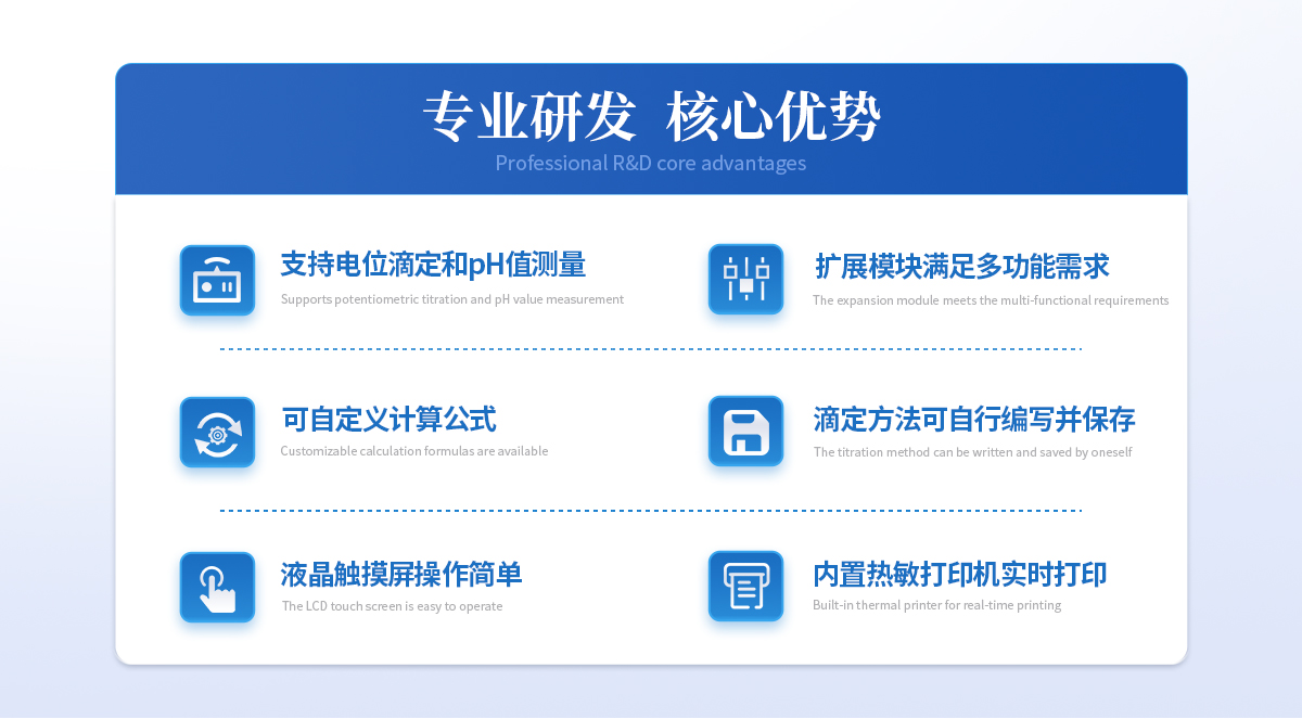 | 1、設備支持電位滴定和pH值測量;用戶選擇不同電極可進行酸堿滴定、氧化還原滴定、沉淀滴定、絡合滴定等多種滴定和pH測量; | 2、用戶可選配電導滴定、永停滴定等擴展模塊,滿足用戶多功能需求; | 3、設備對國家標準中采用的電位滴定法均滿足,用戶可根據檢測需求選擇適配的電極即可; | 4、支持動態滴定、等量滴定、手動滴定的滴定方式,可預設滴定終點或自動識別終點滴定,方便用戶根據樣品特性選擇**滴定工作流程; | 5、可自定義計算公式,根據反應的化學方程式提前設置好計算公式,滴定完成后將自動獲得待測物含量; | 6、滴定方法可自行編寫并保存,形成滴定方法快捷模式,在使用時可直接選擇運行,滴定方法至少可保存100種; | 7、設備可作為實驗室常規手動滴定的滴定裝置使用;計量泵替代滴定管,磁力攪拌功能替代手動搖晃錐形瓶的工作; | 8、儀器實用的三個功能: (1)排氣,可將滴定管或管路內的氣泡排出,避免氣泡帶來的滴定誤差; (2)沖管,可以*少的試劑消耗量使管路內充滿試劑,實現節省試劑的同時減少試劑混合引入的滴定誤差; (3)排空管,可在實驗完成后將管路中的液體收集到滴定管內,避免在拆卸管路時產生藥液濺灑問題。 |