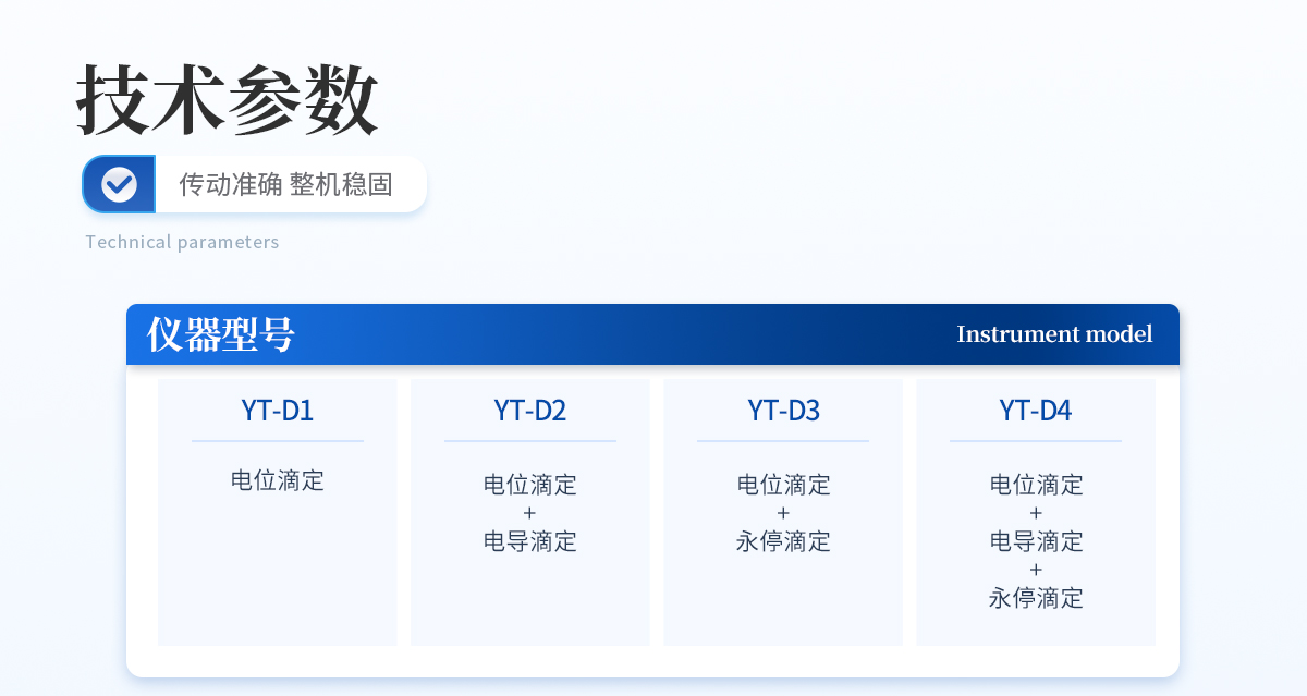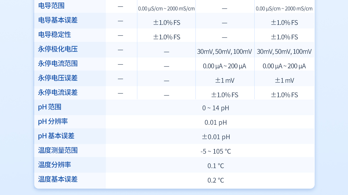 | 滴定分析重復性:≤0.2% | 滴定分析誤差:≤1.5% | 10mL滴定管滴定容量精度:±5μL | 20mL滴定管滴定容量精度:±10μL | 10mL滴定管滴定容量誤差:10μL/10mL | 20mL滴定管滴定容量誤差:20μL/10mL | 電位范圍:-2000—2000mV | 電位分辨率:0.1mV | 電位基本誤差mV:±0.25‰/FS | 電位穩定性mV:±0.3mV/3h | 永停極化電壓:30mV、50mV、100mV | 永停電流范圍:0.00uA-200uA | 永停電壓誤差:±1mV | 永停電流誤差:±1.0% FS | pH范圍:0-14PH | pH分辨率:0.01PH | pH基本誤差:±0.01PH | 溫度測量范圍:-5 - 105℃ | 溫度分辨率:0.1℃ | 溫度基本誤差:0.2℃ |