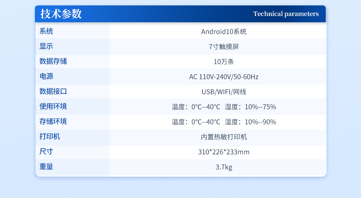 | 系統:Android10系統 | 顯示:7寸觸摸屏 | 數據存儲:10萬條 | 電源:AC 110V-240V/50-60Hz | 數據接口:USB/WIFI/網線 | 使用環境:溫度:0℃--40℃ 濕度:10%--75% | 存儲環境:溫度:0℃--40℃ 濕度:10%--90% | 打印機:內置熱敏打印機 | 尺寸:310*226*233mm | 重量:3.7kg |