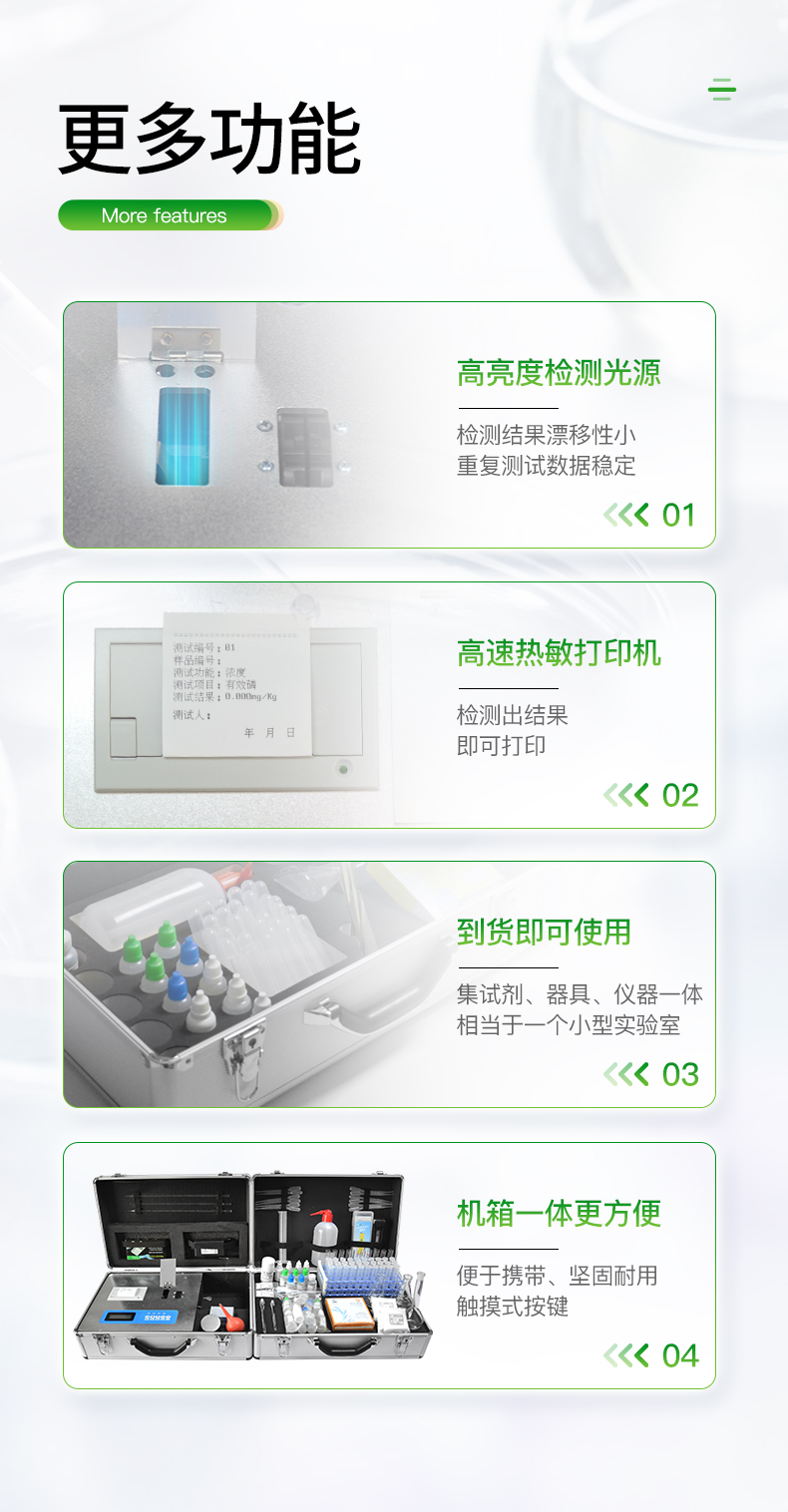 配套齊全,該儀器集藥、器、儀為一體,攜帶方便,相當于一個小型實驗室,用戶只需提供蒸餾水即可在要求時間內完成全部操作。