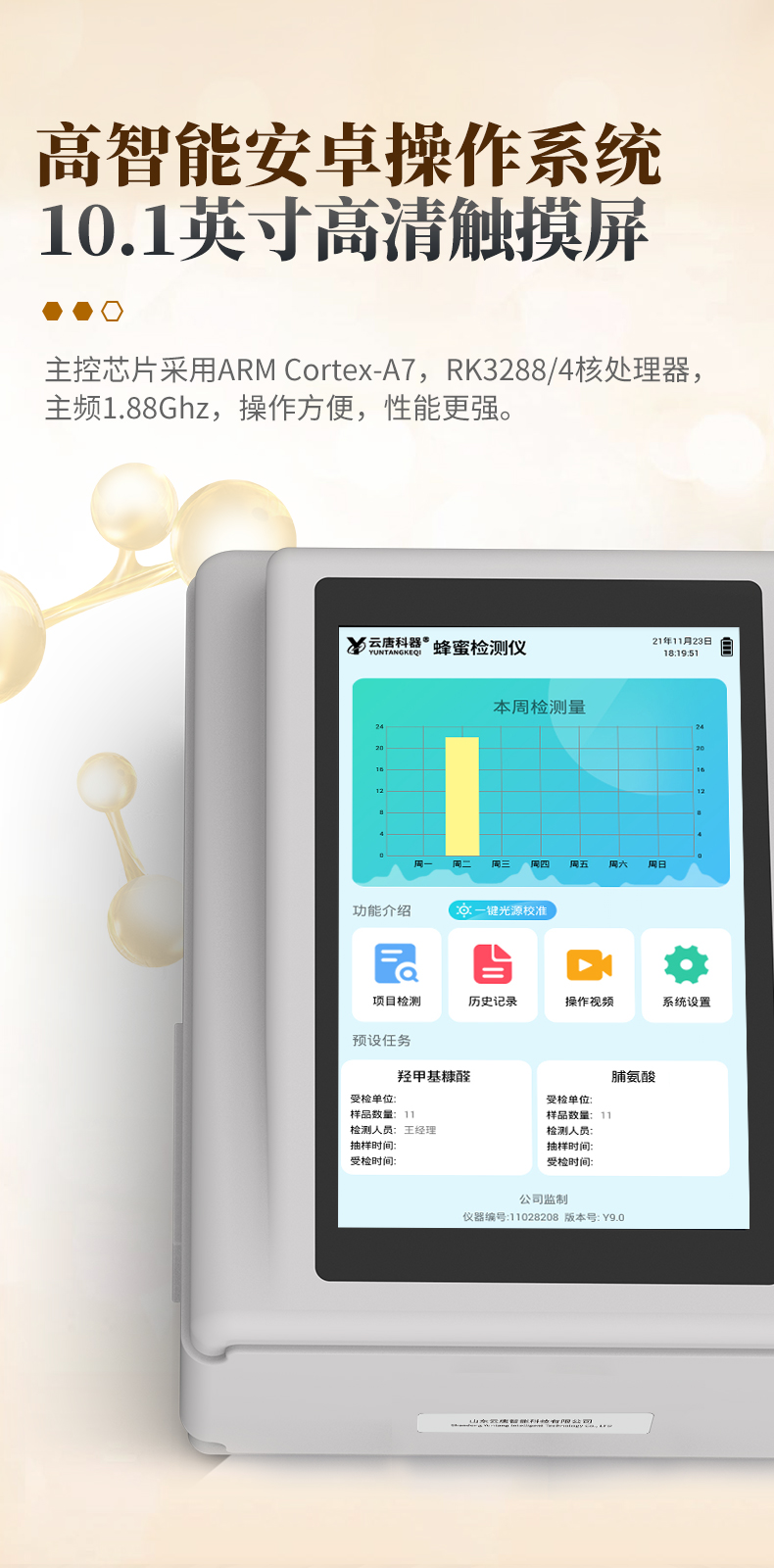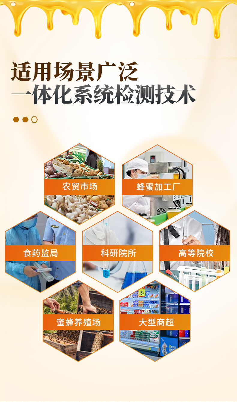 該蜂蜜檢測儀為集成化食品安全快速檢測分析設備,目前已于食藥監局、市場監督部門、高教院校、科研院所、農業部門、蜜蜂養殖場、蜂蜜加工廠等單位廣泛使用。
