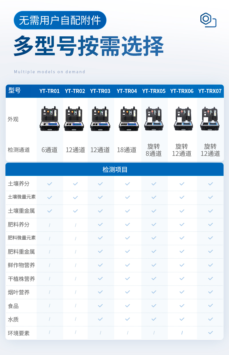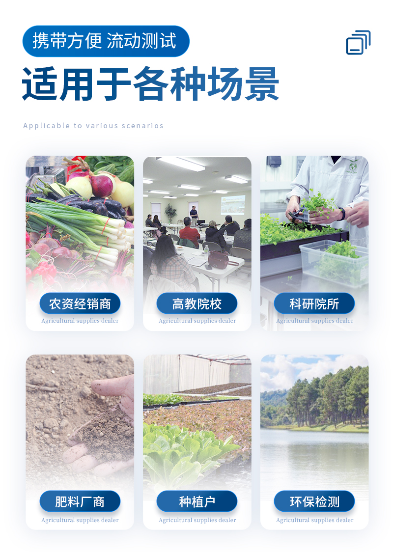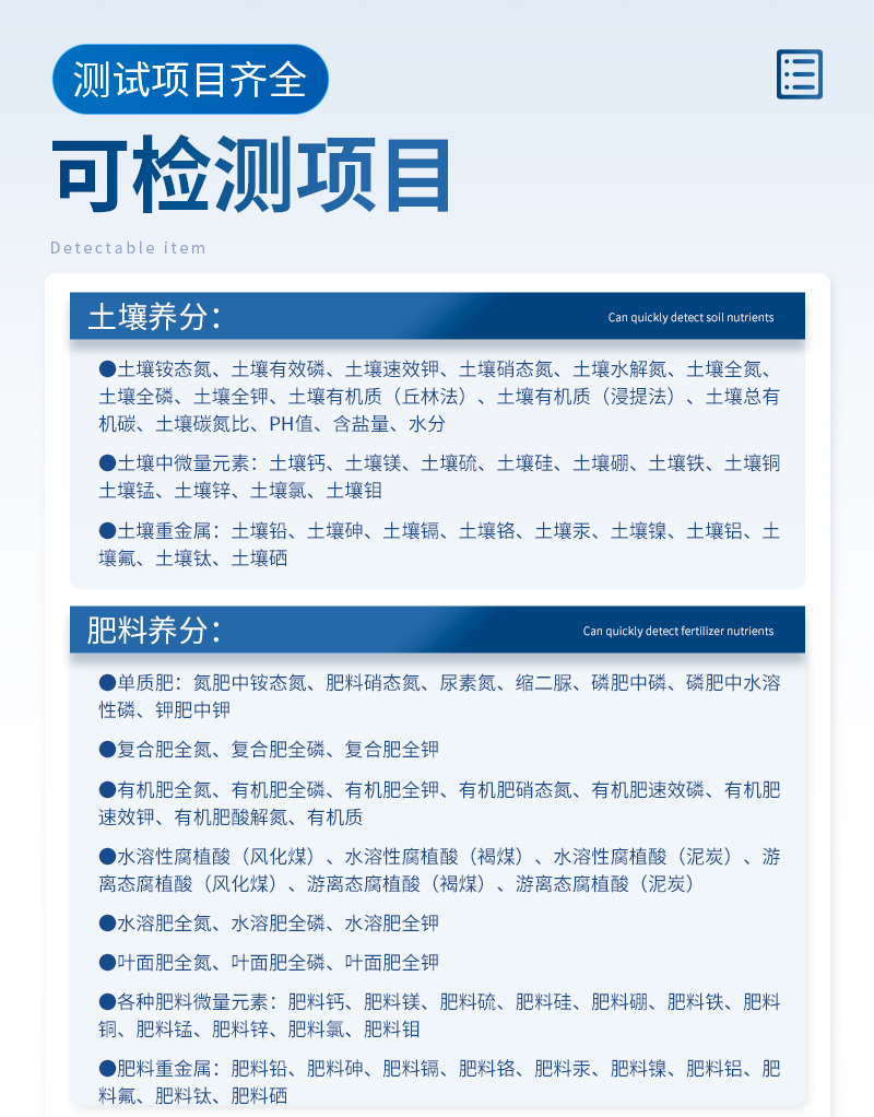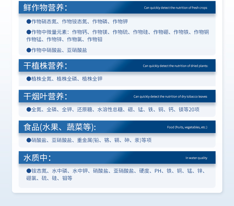 | 1、土壤養(yǎng)分: ●土壤銨態(tài)氮、土壤有效磷、土壤速效鉀、土壤硝態(tài)氮、土壤水解氮、土壤全氮、土壤全磷、土壤全鉀、土壤有機(jī)質(zhì)(丘林法)、土壤有機(jī)質(zhì)(浸提法)、土壤總有機(jī)碳、土壤碳氮比、PH值、含鹽量、水分。 ●土壤中微量元素:土壤鈣、土壤鎂、土壤硫、土壤硅、土壤硼、土壤鐵、土壤銅、土壤錳、土壤鋅、土壤氯、土壤鉬; ●土壤重金屬:土壤鉛、土壤砷、土壤鎘、土壤鉻、土壤汞、土壤鎳、土壤鋁、土壤氟、土壤鈦、土壤硒。 | 2、肥料養(yǎng)分: ●單質(zhì)肥:氮肥中銨態(tài)氮、肥料硝態(tài)氮、尿素氮、縮二脲、磷肥中磷、磷肥中水溶性磷、鉀肥中鉀; ●復(fù)合肥全氮、復(fù)合肥全磷、復(fù)合肥全鉀; ●有機(jī)肥全氮、有機(jī)肥全磷、有機(jī)肥全鉀、有機(jī)肥硝態(tài)氮、有機(jī)肥速效磷、有機(jī)肥速效鉀、有機(jī)肥酸解氮、有機(jī)質(zhì); ●水溶性腐植酸(風(fēng)化煤)、水溶性腐植酸(褐煤)、水溶性腐植酸(泥炭)、游離態(tài)腐植酸(風(fēng)化煤)、游離態(tài)腐植酸(褐煤)、游離態(tài)腐植酸(泥炭); ●水溶肥全氮、水溶肥全磷、水溶肥全鉀; ●葉面肥全氮、葉面肥全磷、葉面肥全鉀; ●各種肥料微量元素:肥料鈣、肥料鎂、肥料硫、肥料硅、肥料硼、肥料鐵、肥料銅、肥料錳、肥料鋅、肥料氯、肥料鉬; ●肥料重金屬:肥料鉛、肥料砷、肥料鎘、肥料鉻、肥料汞、肥料鎳、肥料鋁、肥料氟、肥料鈦、肥料硒。 | 3、鮮作物營(yíng)養(yǎng): ●作物硝態(tài)氮、作物銨態(tài)氮、作物磷、作物鉀; ●作物中微量元素:作物鈣、作物鎂、作物硫、作物硅、作物硼、作物鐵、作物銅、作物錳、作物鋅、作物氯、作物鉬; ●作物中硝酸鹽、亞硝酸鹽。 | 4、干植株?duì)I養(yǎng): ●植株全氮、植株全磷、植株全鉀 | 5、煙葉營(yíng)養(yǎng): ●全氮、全磷、全鉀、還原糖、水溶性總糖、硼、錳、鐵、銅、鈣、鎂等20項(xiàng)。 | 6、食品(水果、蔬菜等): ●硝酸鹽、亞硝酸鹽、重金屬(鉛、鉻、鎘、砷、汞)等項(xiàng)。 | 7、水質(zhì)中: ●銨態(tài)氮、水中磷、水中鉀、硝酸鹽、亞硝酸鹽、硬度、PH、鐵、銅、錳、鋅、硼、氯、硫、硅、鉬等 |