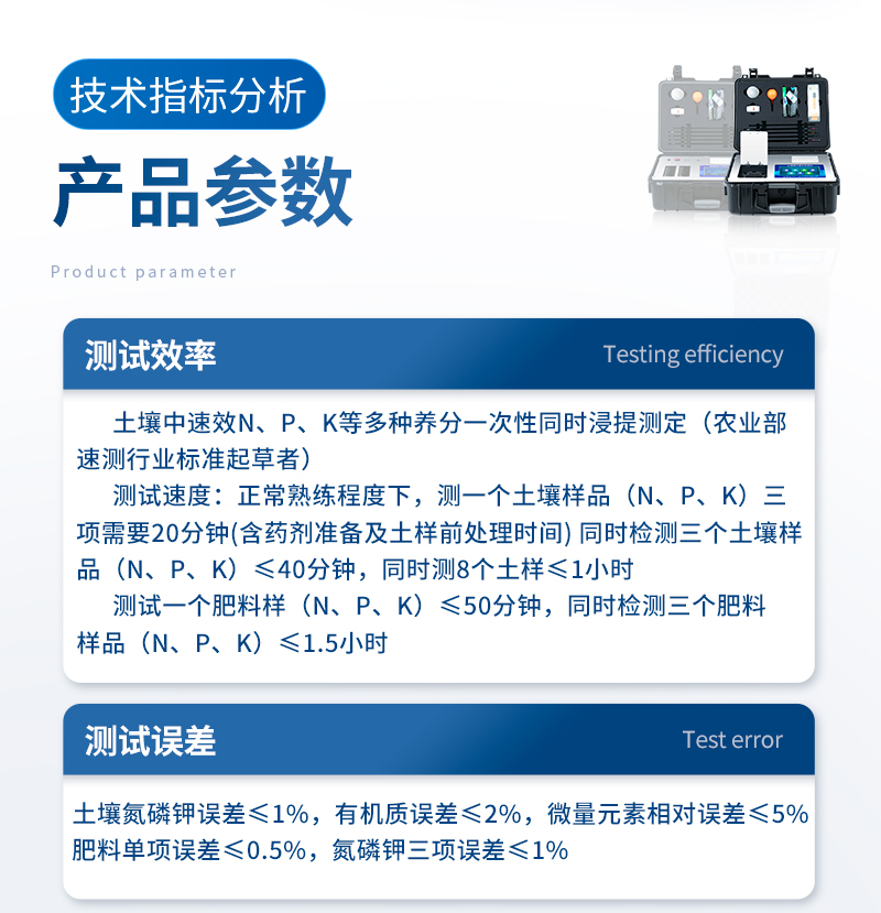 | 土壤中速效N、P、K等多種養(yǎng)分一次性同時(shí)浸提測(cè)定(農(nóng)業(yè)部速測(cè)行業(yè)標(biāo)準(zhǔn)起草者)。 | 肥料中氮(N)、磷(P)、鉀(K)等養(yǎng)分同時(shí)、快速、準(zhǔn)確檢測(cè)。 | 測(cè)試速度:正常熟練程度下: | 測(cè)一個(gè)土壤樣品(N、P、K)三項(xiàng)需要20分鐘(含藥劑準(zhǔn)備及土樣前處理時(shí)間),同時(shí)檢測(cè)三個(gè)土壤樣品(N、P、K)≤40分鐘,同時(shí)測(cè)8個(gè)土樣≤1小時(shí)。 | 測(cè)試一個(gè)肥料樣(N、P、K)≤50分鐘,同時(shí)檢測(cè)三個(gè)肥料樣品(N、P、K)≤1.5小時(shí)。 |