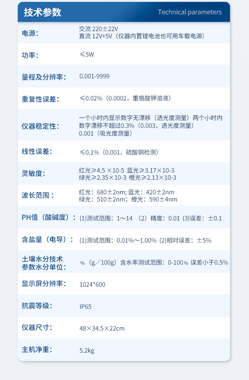 | 1.電源:交流 220±22V 直流 12V+5V(儀器內(nèi)置鋰電池也可用車(chē)載電源) | 2.功率: ≤5W | 3.量程及分辨率:0.001-9999 | 4.重復(fù)性誤差: ≤0.02%(0.0002,重鉻酸鉀溶液) | 5.儀器穩(wěn)定性:一個(gè)小時(shí)內(nèi)顯示數(shù)字無(wú)漂移(透光度測(cè)量);兩個(gè)小時(shí)內(nèi)數(shù)字漂移不超過(guò)0.3%(0.003,透光度測(cè)量)、0.001(吸光度測(cè)量)。 | 6.線性誤差: ≤0.1%(0.001,硫酸銅檢測(cè)) | 7.靈敏度:紅光≥4.5 ×10-5 藍(lán)光≥3.17×10-3 綠光≥2.35×10-3 橙光≥2.13×10-3 | 8.波長(zhǎng)范圍 :紅光:680±2nm; 藍(lán)光:420±2nm; 綠光:510±2nm;橙光:590±4nm | 9.PH值(酸堿度): (1)測(cè)試范圍:1~14 (2)精度:0.01 (3)誤差:±0.1 | 10.含鹽量(電導(dǎo)):(1)測(cè)試范圍:0.01%~1.00% (2)相對(duì)誤差:±5% | 11.土壤水分技術(shù)參數(shù)水分單位:﹪(g/100g);含水率測(cè)試范圍:0-100﹪;誤差小于0.5% | 12.顯示屏分辨率:1024*600 | 13.抗震等級(jí):IP65 | 14、儀器尺寸:48×34.5×22cm | 15、主機(jī)凈重:5.2kg |