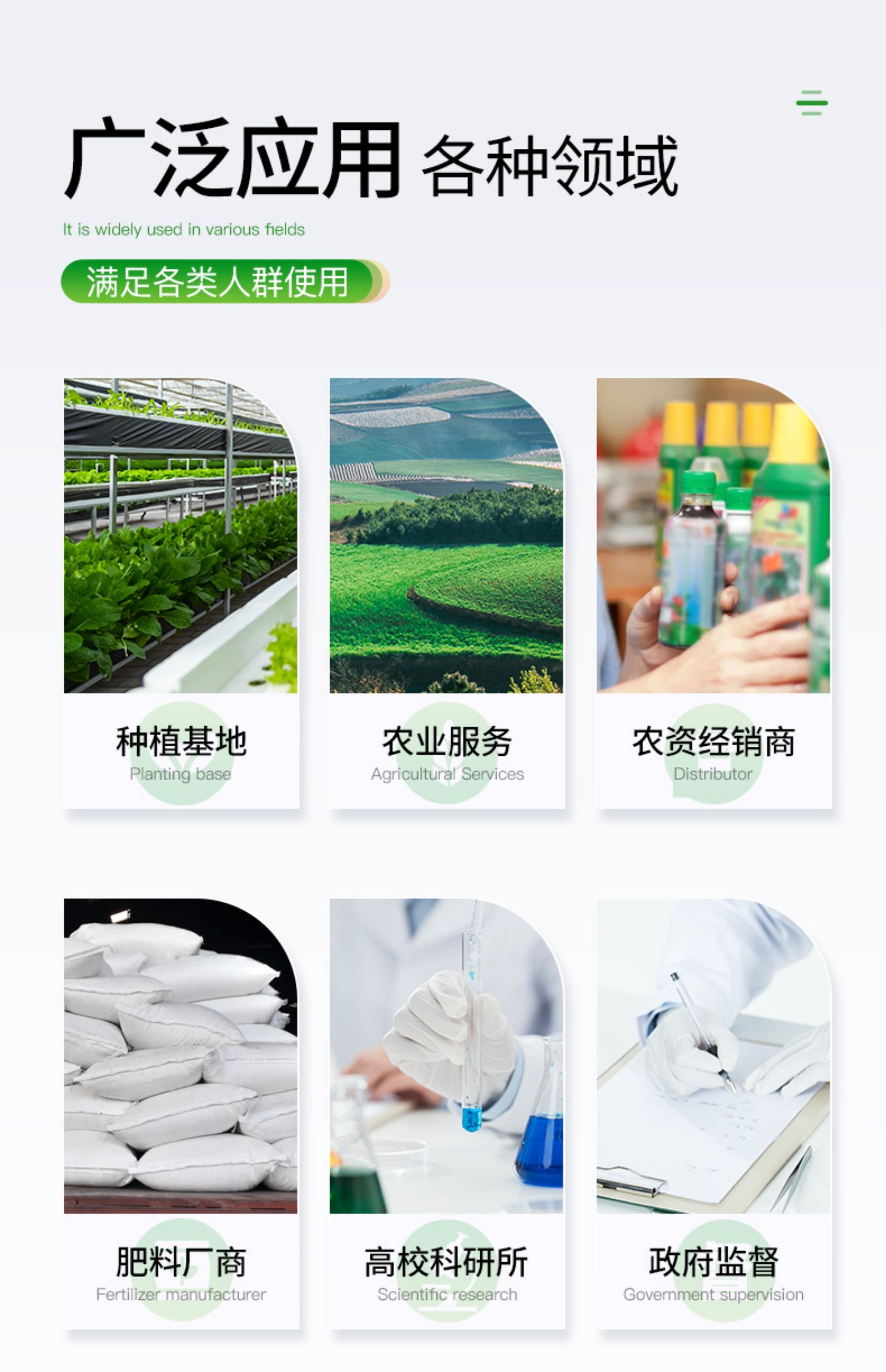| 1、土壤養分: ●土壤銨態氮、土壤有效磷、土壤速效鉀、土壤硝態氮、土壤堿解氮、土壤全氮、土壤全磷、土壤全鉀、土壤有機質(丘林法)、土壤有機質(浸提法)、土壤總有機碳、土壤碳氮比、PH值、含鹽量、水分。 ●土壤中微量元素:土壤鈣、土壤鎂、土壤硫、土壤硅、土壤硼、土壤鐵、土壤銅、土壤錳、土壤鋅、土壤氯、土壤鉬; ●土壤重金屬:土壤鉛、土壤砷、土壤鎘、土壤鉻、土壤汞、土壤鎳、土壤鋁、土壤氟、土壤鈦、土壤硒。 | 2、環境: 土壤濕度、土壤溫度、土壤電導率、空氣溫度、空氣濕度、露點、大氣壓力、光照度、二氧化碳; | 3、肥料養分: ●單質肥:氮肥中銨態氮、肥料硝態氮、尿素氮、縮二脲、磷肥中磷、磷肥中水溶性磷、鉀肥中鉀; ●復合肥全氮、復合肥全磷、復合肥全鉀; ●有機肥全氮、有機肥全磷、有機肥全鉀、有機肥硝態氮、有機肥速效磷、有機肥速效鉀、有機肥酸解氮、有機質; ●水溶性腐植酸(風化煤)、水溶性腐植酸(褐煤)、水溶性腐植酸(泥炭)、游離態腐植酸(風化煤)、游離態腐植酸(褐煤)、游離態腐植酸(泥炭); ●水溶肥全氮、水溶肥全磷、水溶肥全鉀; ●葉面肥全氮、葉面肥全磷、葉面肥全鉀; ●各種肥料微量元素:肥料鈣、肥料鎂、肥料硫、肥料硅、肥料硼、肥料鐵、肥料銅、肥料錳、肥料鋅、肥料氯、肥料鉬; ●肥料重金屬:肥料鉛、肥料砷、肥料鎘、肥料鉻、肥料汞、肥料鎳、肥料鋁、肥料氟、肥料鈦、肥料硒。 | 4、鮮作物營養: ●作物硝態氮、作物銨態氮、作物磷、作物鉀; ●作物中微量元素:作物鈣、作物鎂、作物硫、作物硅、作物硼、作物鐵、作物銅、作物錳、作物鋅、作物氯、作物鉬; ●作物中硝酸鹽、亞硝酸鹽、總糖量、還原糖、蛋白質。 | 5、干植株營養: ●植株全氮、植株全磷、全鉀、植株中微量元素:植株全鈣、植株全鎂、植株全硫、植株全鐵、植株全錳、植株全硼、植株全鋅、植株全銅、植株全氯、植株全硅。 | 6、煙葉營養: ●全氮、全磷、全鉀、還原糖、水溶性總糖、硼、錳、鐵、銅、鈣、鎂等20項。 | 7、食品(水果、蔬菜等): ●農藥殘留、硝酸鹽、亞硝酸鹽、鉛、砷、鎘、鉻、汞、銅、鋁、二氧化硫、雙氧水、苯甲酸鈉、山梨酸、糖精鈉、甜蜜素、硫酸鎂、甲醛、吊白塊、硼砂、溴酸鉀、總酸、色素、蛋白質、葡萄糖、淀粉酶等項。 | 8、水質中: COD、氨氮、總磷、總氮、余氯、溶解氧、二氧化氯、水中氰化物;重金屬鉛、砷、鎘、鉻、汞;水中硝酸鹽、亞硝酸鹽、硬度、PH、鐵、銅、錳、鋅、鋁、硼、氯、硫、硅等 |