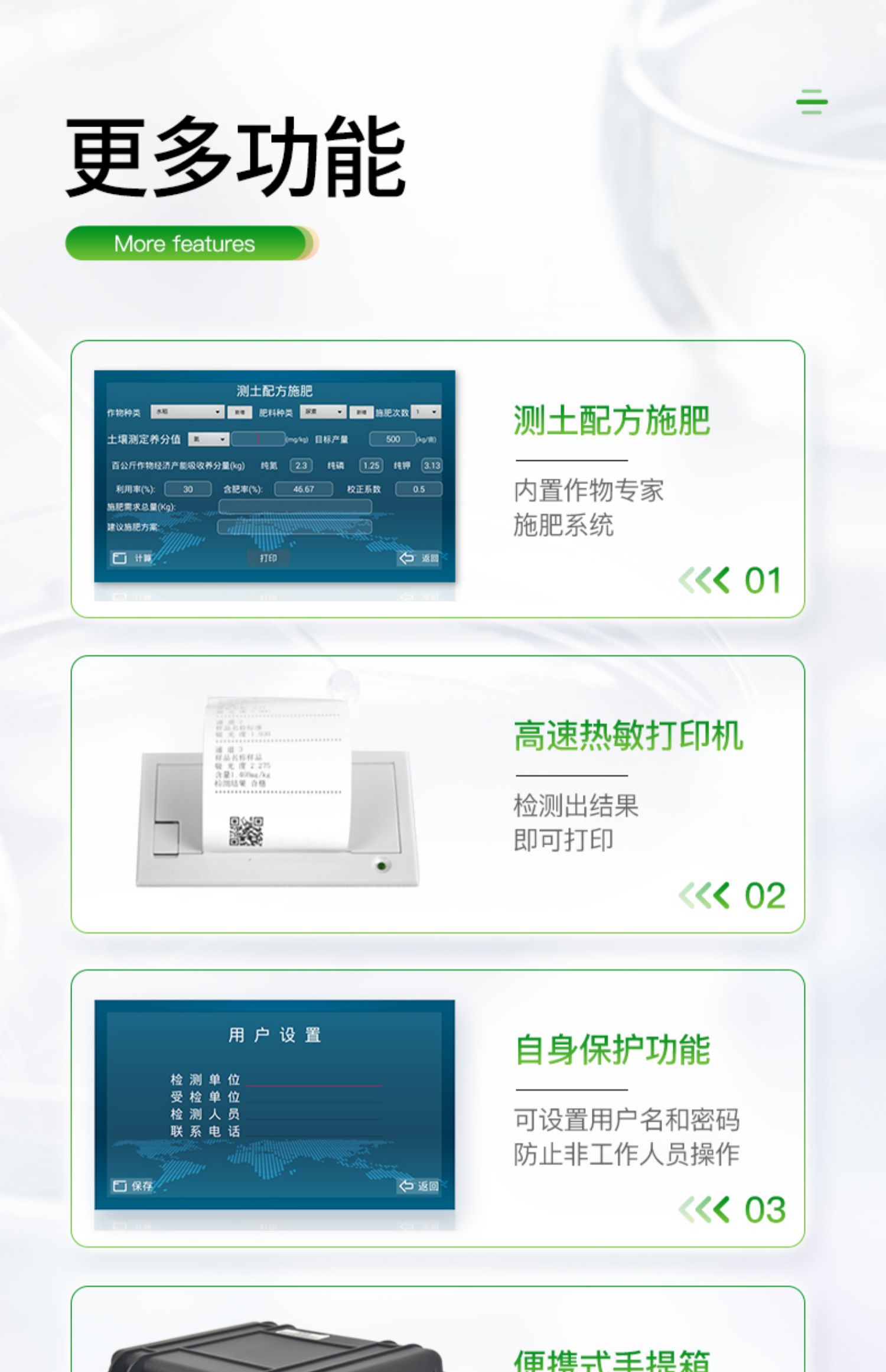 | ★1、安卓智能操作系統Android 7.1版本,主控芯片采用ARM Cortex-A7,RK3288/4核處理器,主頻1.88Ghz,運轉速度更快速,穩定性更強。 | ★2、可檢測各種土壤、肥料、作物、食品、水質、環境等共200多個測試項目,一機多用,功能齊全。 | ★3、測試速度更快!無需空白對照和標準校準,省卻以往繁瑣的操作步驟,一鍵式操作,直接讀取數據,**率,低消耗。 | ★4、采用精密旋轉比色池設計(**號:** 2018 2 1777724.7),光源一致性更加**,保證檢測精度。 | ★5、12個旋轉檢測通道,一次性可快速檢測12個樣品,極大提升檢測效率,降低檢測成本。 | ★6、采用高精度濾光片技術自主**分析方法(**號:** 2020 2 1763837.9),權威認證。 | ★7、具有自身保護功能,內置人臉識別攝像頭可掃臉登錄,也可設置用戶名和密碼,防止非工作人員操作查看實驗數據。 | ★8、檢測過程中內置校準功能,智能恒流穩壓,光強自動校準,確保檢測準確度,取得中國計量科學研究院的《校準證書》。 | ★9、內置傳感器航空接口,插拔方便,配備FDR傳感器、環境多要素傳感器。 | ★10、FDR傳感器為土壤三參數一體式,可同時測量土壤水分含量、土壤環境溫度、土壤電導率(鹽分)方便快捷。 | ★11、環境多要素傳感器為6要素一體式,可同時測量空氣溫度、空氣濕度、露點、大氣壓力、光照度、二氧化碳。 | ★12、儀器標配wifi無線上傳、4G聯網傳輸、GPRS無線遠傳,快速上傳數據。 | ★13、配有智慧云農業平臺,儀器連入無線網絡后,可將檢測數據可選擇性或批量無線上傳,方便用戶進行數據管理和長期分析。 | 14、儀器配同時具有USB接口、以太網接口,內置大容量內存,并可隨時用U盤拷貝數據。 | ★15、可用手機隨時登錄云平臺在線移動查看歷史數據 | ★16、內置作物專家施肥系統,可對百余種全國農業經濟作物、果樹等的目標產量計算推薦施肥量,依據施肥配方科學指導農業生產。測土配方施肥結果可打印,打印內容包含:作物種類、肥料種類、目標產量、需求總量、建議施肥方案。 | ★17、內置植物營養診斷標準圖譜,根據各農作物營養缺失的圖片,進行葉面對比,診斷豐缺。 | ★18、4波長專業測試冷光源(紅、藍、綠、橙),光源波長穩定,長時間連續工作光源無溫漂現象,壽命長達10萬小時級別,重現性好,準確度高。 | 19、比色池部分采用標準1cm比色皿,無機械位移及磨損,光路測試定位**,有效屏蔽外光干擾,保證檢測結果優于國標要求。 | ★20、儀器系統內帶有樣品前處理操作視頻,各種樣品檢測方法點擊視頻模塊即可觀看,檢測人員無需自學說明書,指導教學方便快速,方便新手快速操作。 | 21、內置新一代高速熱敏打印機(無需色帶),打印內容包含:檢測單位、檢測人員、檢測項目、通道號、吸光度、養分含量(mg/kg)、檢測時間、以及二維碼等信息 | ★22、高靈敏7寸真彩觸摸屏,采用更加**和人性化操作,高清晰高交互顯示,大程度降低傳統儀器的繁瑣操作和失誤,并取得多項《軟件著作權》。 | 23、內置時鐘功能,方便操作時間記錄,長期歷史追溯。 | 24、可設置多賬戶賬號密碼登錄,**UI交互界面,不同的用戶可自由添加編輯檢測信息,保存后可長期使用。 | 25、GPS功能:可在野外作業時記錄經緯度地點,滿足特殊用戶需求。 | 26、內置低電壓提示功能,可在檢測時明確電量,避免測試數據偏移,同時具有斷電保護功能,斷電自動保存數據,防止數據丟失。 | ★27、交直流兩用供電方式,內置大容量充電鋰電池,滿電狀態下可連續工作10余小時,同時可外接車載電源蓄電。 | ★28、儀器具有中英文切換功能,可滿足出口要求。 | 29、高強度PVC工程塑料手提箱設計,堅固耐用,便于攜帶。 |