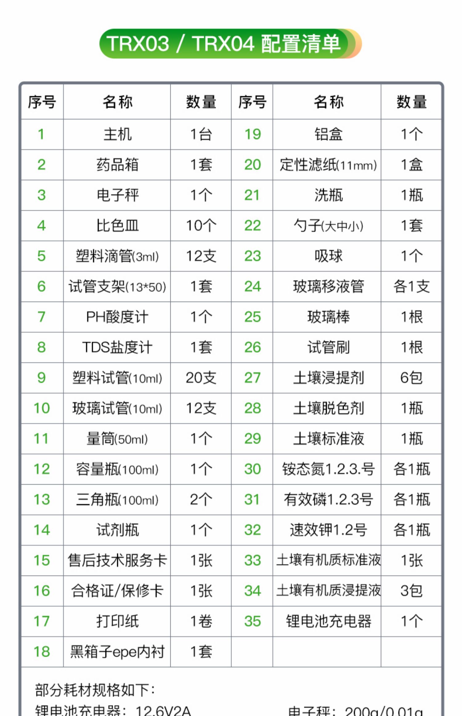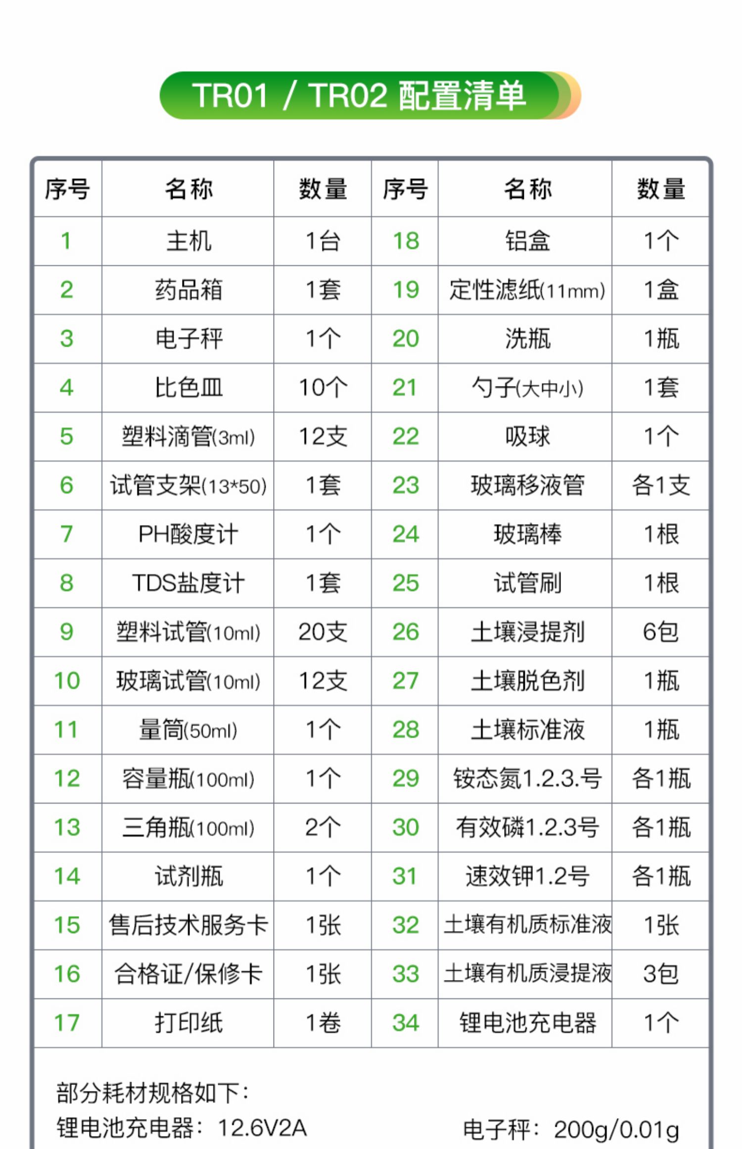| 名稱 | 藥品箱 | 氮磷鉀有機質試劑 | 定性濾紙 | 比色皿 | 玻璃試管 | 塑料試管 | 三角瓶100ml | 試劑瓶 | 量筒50ml | 塑料滴管 | 試管架 | 試管刷 | 洗瓶 | 稱量勺 | 電源適配器 |