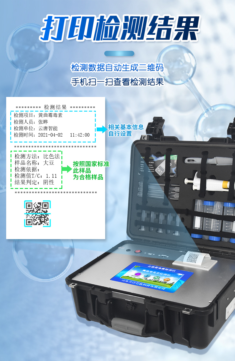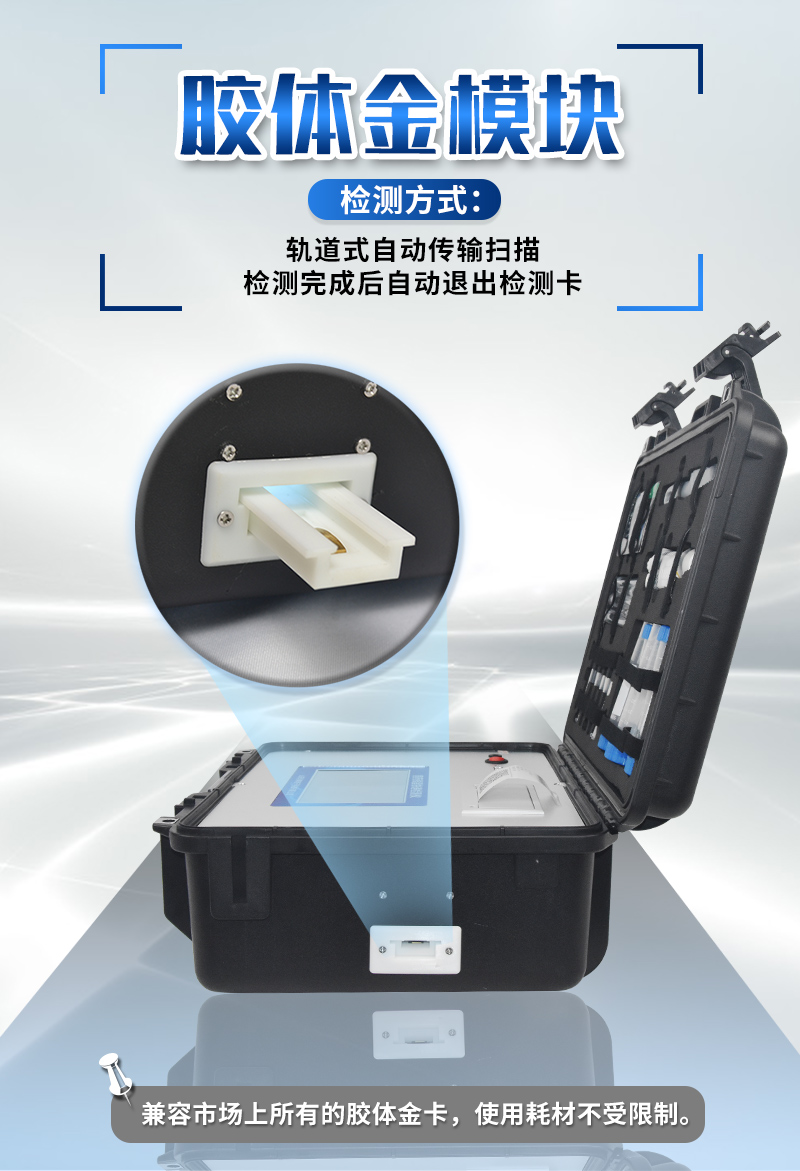 | 1、安卓智能操作系統,采用更加**和人性化操作,儀器具有網線連接、wifi聯網上傳、GPRS無線遠傳功能,快速上傳數據。 | 2、智能化程度高,儀器具有自檢功能:具有開機自檢和調零功能,具有自動檢測重復性功能。 | 3、新一代高速熱敏打印機,檢測完成可自動打印檢測報告和二維碼。 | 4、儀器帶有監管平臺,數據可局域網和互聯網數據上傳,檢測結果直接傳至食品安全監管平臺。進行區域食品安全監管及大數據分析處理與數據統計,檢測區域食品安全長短期動態,達到食品安全問題預估、預警 | 5、一體化主機,包含食品安全檢測模塊、多通道農藥殘留檢測模塊、膠體金免疫層析檢測模塊。 | 6、一體化便攜式快檢設備,滿足現場及流動檢測使用需求,能夠在同一軟件下實現所有檢測項目的檢測,并可通過同一窗口直觀顯示檢測結果。 | 7、膠體金模塊檢測方式:軌道式自動傳輸掃描,檢測完成后自動退出檢測卡。 | 8、CT線自動識別,無需手動調整。 | 9、儀器具有品類多種類樣品菜單庫,可靈活選擇檢測樣品,不同的檢測通道可同時檢測不同的樣品項目。 | 10、樣品處理簡單省力,整體操作快速、安全、便捷。 | 11、儀器具有自身保護功能,可設置用戶名及密碼,防止非工作人員操作等。 | 12、高靈敏度,高檢測精度,高重復性精度,掃描式高精度光學傳感器。 | 13、內置強大的數據庫,可在儀器上直接選擇樣品名稱、檢測指標、送檢單位等信息,也可在儀器上直接編輯錄入樣品名稱、檢測指標、送檢單位等信息并保存進樣品數據庫。 | 14、儀器具有重新校準、鎖定、恢復出廠設置功能。 | 15、結果判定線可修改,對照值標定值可保存,斷電不丟失數據。 | 16、兼容市場上所有的膠體金卡,使用耗材不受限制,極大增強用戶使用體驗。 |