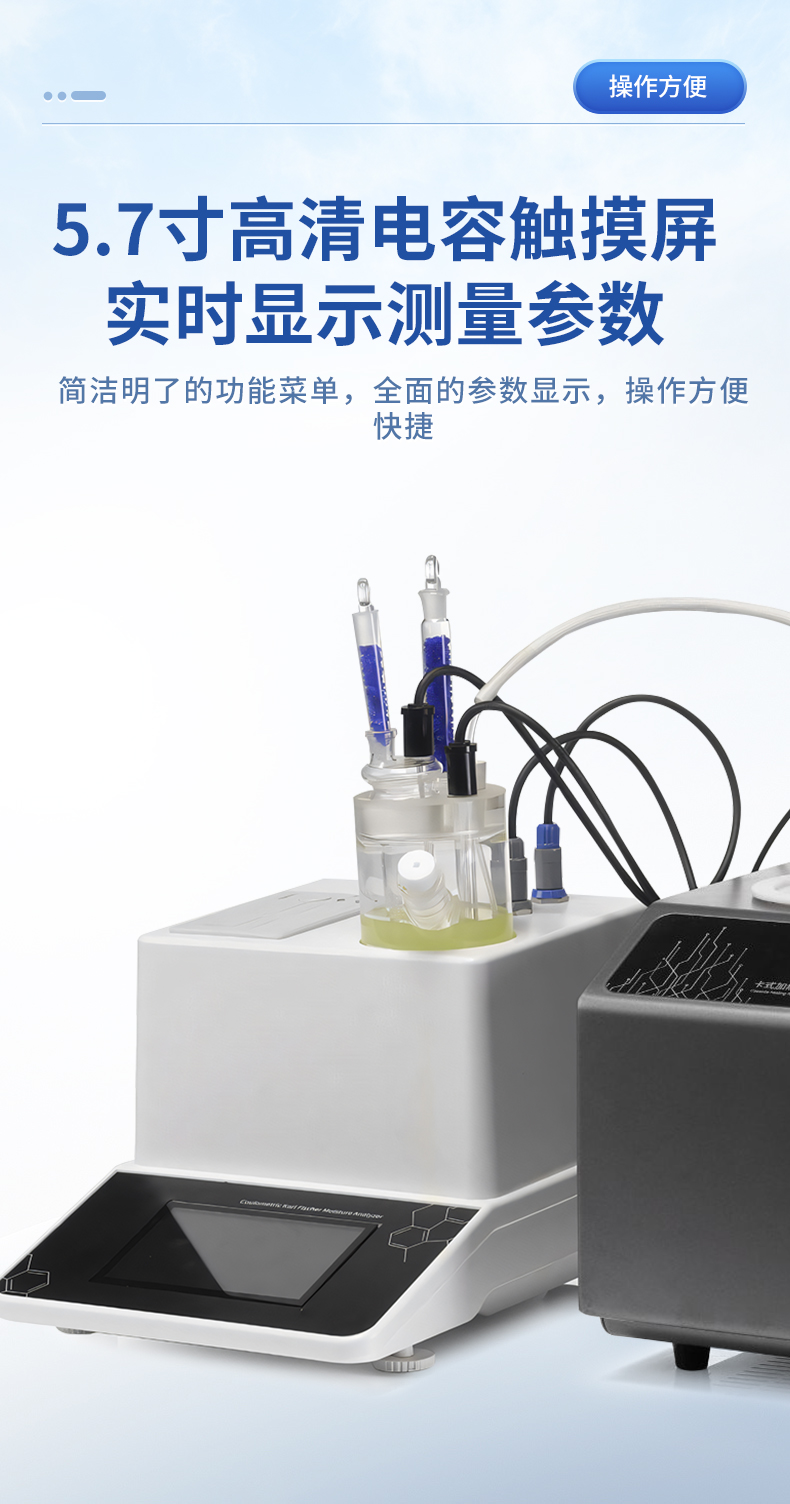 | 1. 采用高精度庫侖法水分測定儀與卡氏加熱爐聯用,**可以檢測到3μg水,精度達到ppm級; | 2. 空芯氣針進樣,和帶加熱功能的氣體輸送管路,零死體積水汽不凝結,操作更簡單,同時也很大的提高了儀器的準確性和重復性; | 3. 5.7寸高清電容觸摸屏,實時顯示測量參數,簡潔明了的功能菜單,全面的參數顯示,操作方便快捷 ; | 4. 內置5種方法可供選擇,8種計算公式方便各種樣品檢測,自定義樣品單位%、ppm、mg/kg等結果單位更加人性化; | 5. 系統實時檢測環境中的水分,精準扣除漂移,采用實時動態阻抗法判定滴定終點,測量結果更精準; | 6. **溫度300℃可以滿足大部分樣品檢測,氣流0-100ml可調,適合各種水分釋放速度的樣品; | 7. 操作方便,用戶只需要設置合適的溫度,合適的流量,把樣品放入事先準備好的樣品瓶,放入加熱器,然后把傳輸針扎入樣品瓶的硅膠墊,在儀器上點開始測量即可; | 8. 無需等待上一次樣品瓶冷卻之后才能進行下一次樣品測量,更換樣品瓶過程中樣品瓶始終保持密封狀態,測量效率更高更準確,尤其是吸濕性強的樣品無需擔心空氣中水分的干擾; | 9. 采用頂空進樣的方式,保證每個測定采用“新”的樣品瓶,樣品測定無交叉感染。樣品瓶體積小,確保較小的死體積和背景水分值。獨立密閉樣品瓶,測定時無需樣品轉移,結果更準確; | 10. 旋蓋式樣品瓶,無需專用且昂貴的壓蓋器和開蓋器,使用非常方便; | 11. 頂空進樣技術,只有氣體進入水分測定儀反應杯,不污染反應杯及電解電極。 |