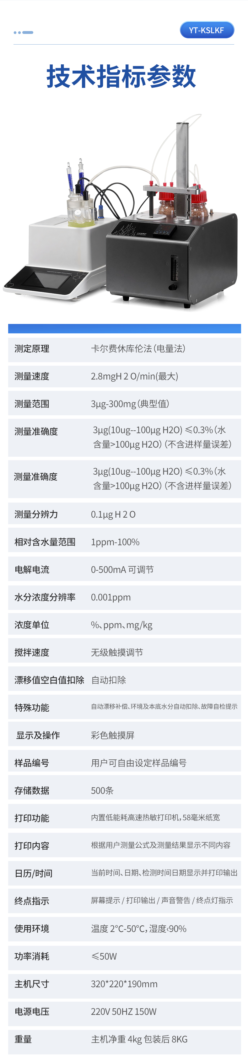 簡介:產品介紹:YT-KSLKF卡氏水分測定儀填補了國內空白,采用獨特的針頭設計,一次操作既可以實現載氣輸入,水汽輸出,同時由于新的氣路設計用極小的流量就可以實現水分蒸汽的傳輸,每次進樣只需更換樣品瓶操作方便,無需等待樣品瓶冷卻之后更換瓶蓋。適用場景:1、微量水分檢測,儀器檢測精度可以達到ppm級,非常適合鋰電、塑料