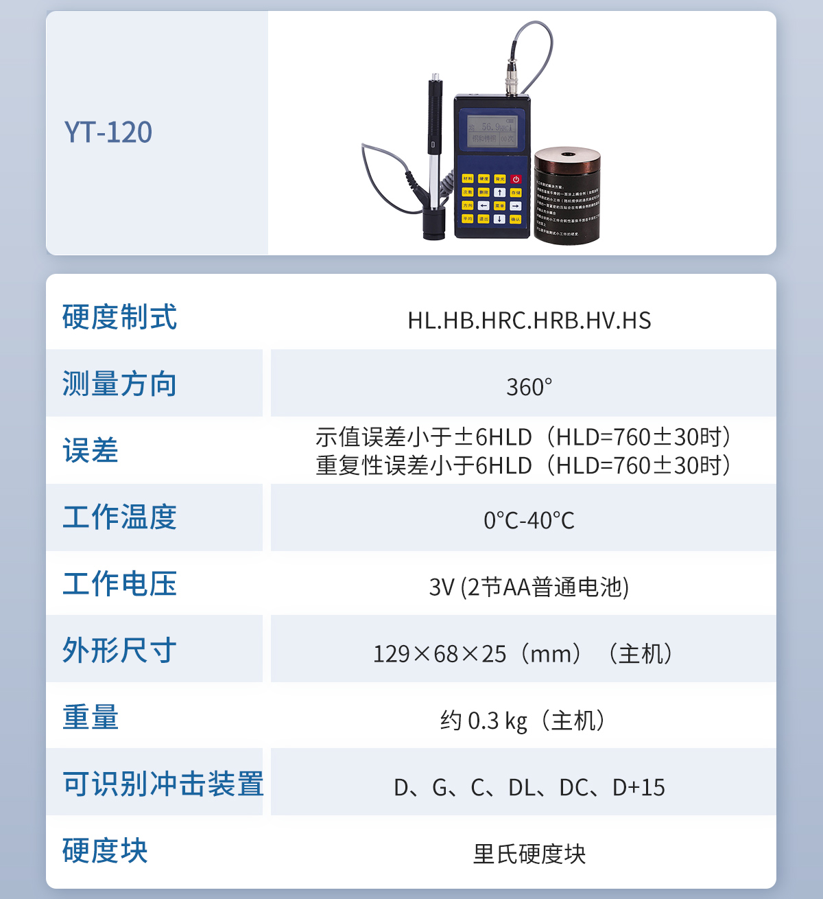 YT-110里氏硬度計是我公司生產的多功能的硬度測量儀器。使用全中文顯示,菜單式操作,操作簡單、方便。本機可直接;顯示里氏、布氏、洛氏、維氏、肖氏等各種硬度值。儀器小巧、便攜、可靠性高,適用于惡劣的操作環境,抗振動、沖擊和電磁干擾。