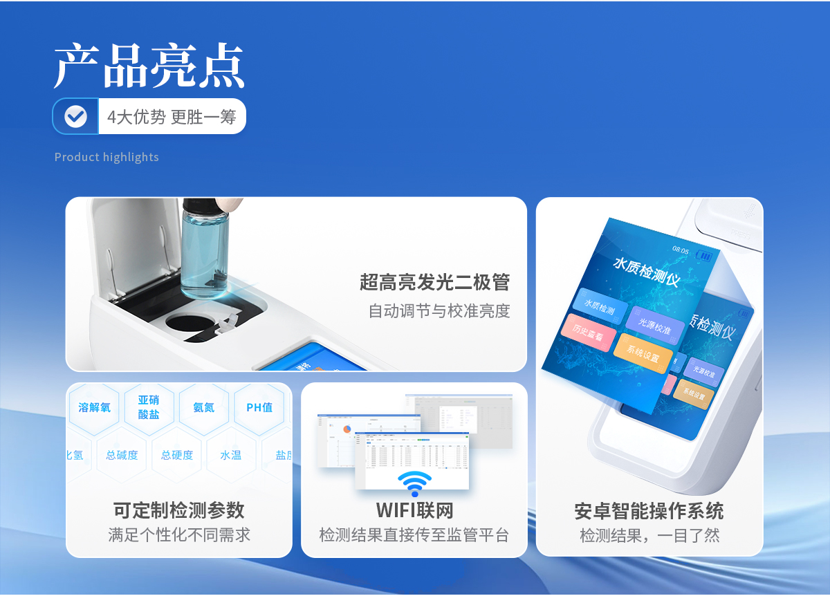 快速檢測水體中磷酸鹽指標 安卓智能系統操作更佳簡便快捷 內置操作流程、操作簡單、無需培訓、直接上手 檢測速度快,現場讀取數據 便攜式體積小,重量輕,方便戶外檢測 外形小巧美觀,工作穩定免維護,具有較好的性價比 采用進口冷光源,光學性能穩定,壽命長達10萬小時