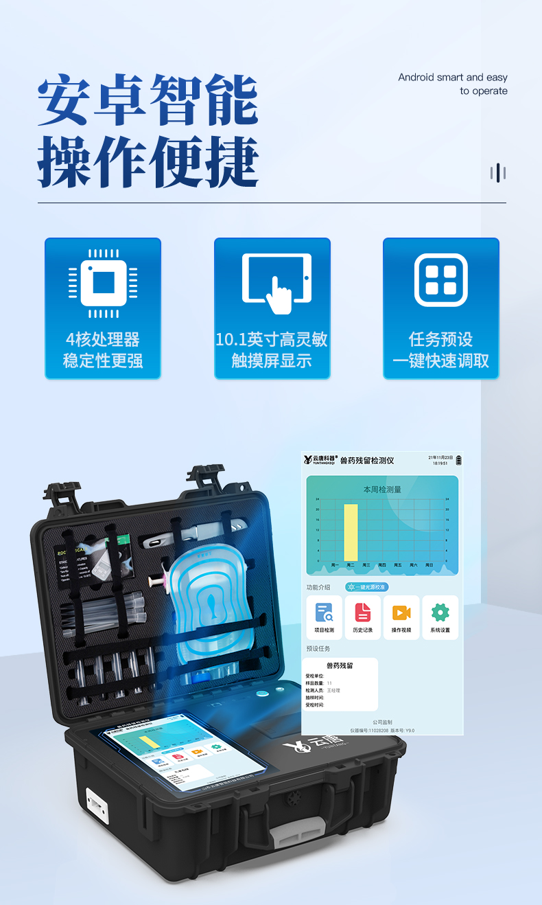 | 儀器采用手提一體化系統檢測技術,將分光光度模塊、數字化管理模塊、無線通訊模塊高度集成于一體,可支持檢測60種食品安全檢測項目,同時預留升級檢測方法。 | 儀器檢測模塊標準化、智能化,檢測項目可隨意自由組合。檢測箱體內置多個標準檢測單元,檢測模塊可以調整配置。 | 顯示屏幕:儀器采用10.1英寸豎向液晶觸摸屏顯,搭配運行安卓智能操作系統,主控芯片采用ARM Cortex-A7,RK3288/4核處理器,主頻1.88Ghz,操作方便,性能更強。 | 檢測通道:≥12通道;采用精密旋轉比色池設計,使用同芯片同光源校準精度,解決不同光源之間的誤差值,更加準確**。(1-12通道間誤差0.1%,**號:**202022821055.2) | 儀器光源:高精度進口四波長冷光源,每個通道均配置 410、520、590、630nm 波長光源,標配**的光路切換裝置,**光路切換功能可實現64波長,并且所有檢測項目可實現所有通道同時檢測。 | 設備可一鍵校準,自動保存校準數據,自動對比校驗,得到精準光源,采用Android SP存儲數據,光源數據永不丟失,方便每一次使用。 | 通訊接口:配備無線通信模塊、4G(APN)通訊模塊、藍牙傳輸,同時具有雙USB接口以及RJ45網線接口,可以多方式實現數據保存及數據傳輸。 | 存儲方式:支持U盤存儲,標準USB接口,免驅動安裝。檢測結果存儲容量20萬條以上,可生成Excel表格進行拷貝,并具有登錄保護功能。 | 智能化操作系統: | 1、操作系統:儀器可在同一檢測界面自動對應相關檢測通道,一次性選擇1-12個樣品名稱,無需退出界面,節省操作時間。并可以對每個通道屬性和樣品信息單獨進行編輯,例如送檢單位、人員,檢測人員等,打印時勾選打印顯示。 | 2、數據集成系統:設備首頁自動匯總分析檢測數據,包含:周檢測數據、月檢測數據,全部檢測總數量,均包含檢測總數,合格數,不合格數,以及相關柱形分析圖,各項檢測數據一目了然,無需電腦查詢,更加快捷直觀。 | 3、數據庫系統:十幾項數據庫分類管理儀器:包含項目類型、項目數據、檢測數據、歷史記錄、國標信息、曲線信息、采樣信息、檢測信息、受檢信息、復核信息、圖表信息、光源校準信息、打印樣式信息、樣品庫信息等等,數據庫之間互相協調聯動保證數據的真實完整性。同時產品數據庫以及歷史檢測記錄支持一鍵檢索功能。 | 4、限量規判系統:具有限量查詢、添加物質合規判定系統。檢測出結果后,系統自動調用系統數據庫中相關國標進行比對判定,客觀顯示判定結果是否合格。 | 5、項目預設系統:儀器具有任務預設模塊,一鍵提前預設,給出方便快捷的新檢測方案,每一個任務分別可以設置不同的樣品、批次、編號、來源、備注、抽樣信息、檢測信息、受檢信息、復核信息等更多信息。樣品送檢時一鍵調取保存信息,并可多次調取,大大提高檢測效率。 | 6、數據監管系統:同步對接監管平臺,數據可局域網和互聯網數據上傳,檢測結果可選擇直接傳至食品安全監管平臺。進行區域食品安全監管及大數據分析處理與數據統計,檢測區域食品安全長短期動態,達到食品安全問題預估、預警。 | 7.1、全新打印系統:內置全新打印機,新創自定義打印方式,可按需靈活勾選控制:二維碼,抽樣信息、檢測信息,受檢信息、復核信息、抽樣日期、檢測日期等信息的打印。 | 7.2、A4紙版本報告打印功能(可選配):設備擁有兩種結果展示方式,可以自動生成A4打印模板和小票打印模板兩種樣式,可通過WiFi及網線等方式鏈接外置打印機可進行打印。 | 供電模式:儀器交直流兩用,直流12V供電,可連接車載電源,可配6ah大容量充電鋰電池,電量可實時顯示,方便戶外流動測試。 | 儀器具備遠程升級功能,可定向分客戶分儀器更新,開機后自動更新,并可持續性免費更新系統版本,無需像傳統產品返廠更新,節省時間及人力成本并避免了物流運輸返廠升級導致設備損壞的潛在風險。 |