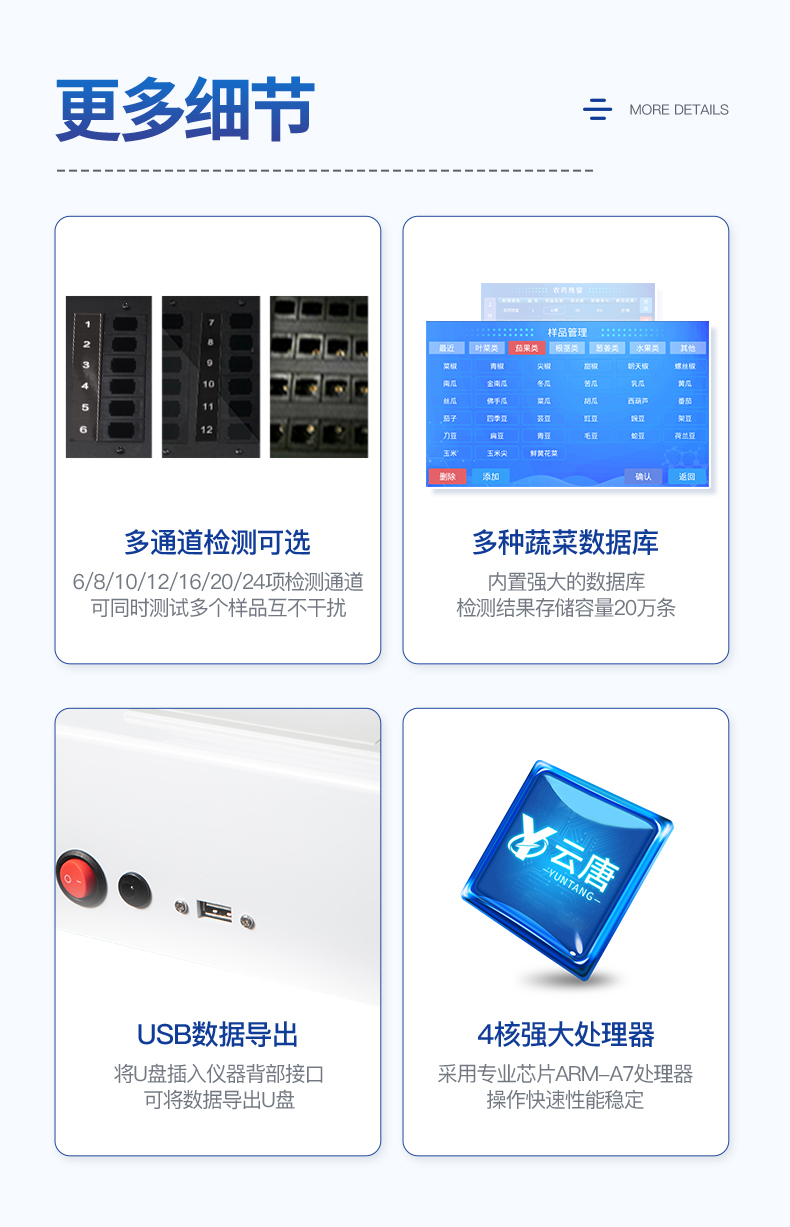 | 乙酰膽堿酯酶和丁酰膽堿酯酶試劑均可以使用,符合國家標準和農(nóng)業(yè)部標準的要求。 | 自動判斷樣品是否合格,檢測結(jié)果更加直觀。 | 儀器具有100多種蔬菜名稱菜單庫,分類管理,并可按需添加或刪除蔬菜名,編輯蔬菜名稱,可直接打印出蔬菜名稱。 | 檢測通道:12個檢測通道,可以同時測試多個樣品,循環(huán)檢測,即放即檢,每個樣品由程序控制分別獨立工作,不會互相干擾。 | 智能操作系統(tǒng),采用更加人性化操作,主控采用多核處理器,主頻1.88Ghz,運轉(zhuǎn)速度更快速,穩(wěn)定性更強。 | 顯示方式:7英寸高靈敏真彩觸摸屏顯示,人性化中文操作界面,讀數(shù)直觀、簡單。 | 打印機采用串口5v打印,可選擇手動打印或者自動打印,三分鐘出打印結(jié)果,打印格式為檢測人姓名、吸光度差值、檢測時間、檢測機構(gòu)、樣品名稱及結(jié)果判定。 | 光源采用進口超高亮發(fā)光二極管,具有低功耗、高精度、穩(wěn)定性強、光源可控可以關(guān)掉不使用的光源,響應速度快等優(yōu)點。 | 智能恒流穩(wěn)壓,光強自動校準,長時間連續(xù)工作光源無溫漂現(xiàn)象。 | 儀器具有GPRS遠傳功能,可插手機卡實現(xiàn)數(shù)據(jù)遠傳平臺,wifi聯(lián)網(wǎng)功能,可將數(shù)據(jù)快速上傳電腦,進行數(shù)據(jù)管理與統(tǒng)計。 | 采用USB2.0接口設(shè)計,方便數(shù)據(jù)的存貯和移動,并可隨時與計算機直接相連,并且可用計算機控制儀器。實現(xiàn)數(shù)據(jù)查詢、瀏覽、分析、統(tǒng)計、打印等。 | 智能化程度高,儀器具有自檢功能:具有開機自檢和調(diào)零功能,具有自動檢測重復性功能 | 儀器具有自身保護功能,可設(shè)置用戶名及密碼,防止非工作人員操作等。 | 采用DC12v直流供電,安全系統(tǒng)更高,并且配備6A鋰電池充電器。 | 儀器具有重新校準、鎖定、恢復出廠設(shè)置功能。 |