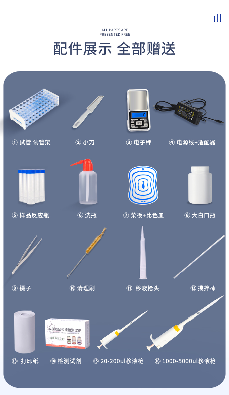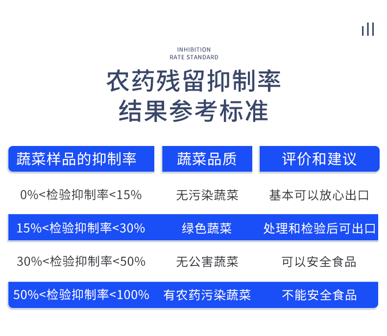 檢測標(biāo)準(zhǔn):依據(jù)國家標(biāo)準(zhǔn)方法(GB/T5009.199-2003)以及世界衛(wèi)生組織WHO、世界糧農(nóng)組織FAO殘留農(nóng)藥檢測標(biāo)準(zhǔn)、世界環(huán)境保護(hù)局EPA參照攝入量等要求來設(shè)計(jì)。采用酶抑制率比色法對水果、蔬菜等農(nóng)林產(chǎn)品中有機(jī)磷和氨基甲酸酯類農(nóng)藥含量進(jìn)行快速準(zhǔn)確的檢測,乙酰膽堿酯酶和丁酰膽堿酯酶試劑均可以使用,符合國家標(biāo)準(zhǔn)和農(nóng)業(yè)部標(biāo)準(zhǔn)的要求。