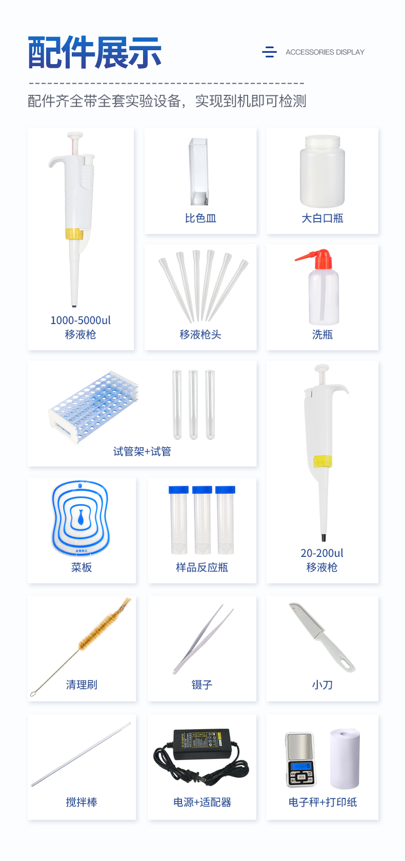 | 乙酰膽堿酯酶和丁酰膽堿酯酶試劑均可以使用,符合國家標準和農業部標準的要求。 | 自動判斷樣品是否合格,檢測結果更加直觀。 | 儀器具有100多種蔬菜名稱菜單庫,分類管理,并可按需添加或刪除蔬菜名,編輯蔬菜名稱,可直接打印出蔬菜名稱。 | 檢測通道:6個檢測通道,可以同時測試多個樣品,循環檢測,即放即檢,每個樣品由程序控制分別獨立工作,不會互相干擾。 | 智能操作系統,采用更加人性化操作,主控采用多核處理器,主頻1.88Ghz,運轉速度更快速,穩定性更強。 | 顯示方式:7英寸高靈敏真彩觸摸屏顯示,人性化中文操作界面,讀數直觀、簡單。 | 打印機采用串口5v打印,可選擇手動打印或者自動打印,三分鐘出打印結果,打印格式為檢測人姓名、吸光度差值、檢測時間、檢測機構、樣品名稱及結果判定。 | 光源采用進口超高亮發光二極管,具有低功耗、高精度、穩定性強、光源可控可以關掉不使用的光源,響應速度快等優點。 | 智能恒流穩壓,光強自動校準,長時間連續工作光源無溫漂現象。 | 儀器具有GPRS遠傳功能,可插手機卡實現數據遠傳平臺,wifi聯網功能,可將數據快速上傳電腦,進行數據管理與統計。 | 采用USB2.0接口設計,方便數據的存貯和移動,并可隨時與計算機直接相連,并且可用計算機控制儀器。實現數據查詢、瀏覽、分析、統計、打印等。 | 智能化程度高,儀器具有自檢功能:具有開機自檢和調零功能,具有自動檢測重復性功能 | 儀器具有自身保護功能,可設置用戶名及密碼,防止非工作人員操作等。 | 采用DC12v直流供電,安全系統更高,并且配備6A鋰電池充電器。 | 儀器具有重新校準、鎖定、恢復出廠設置功能。 |