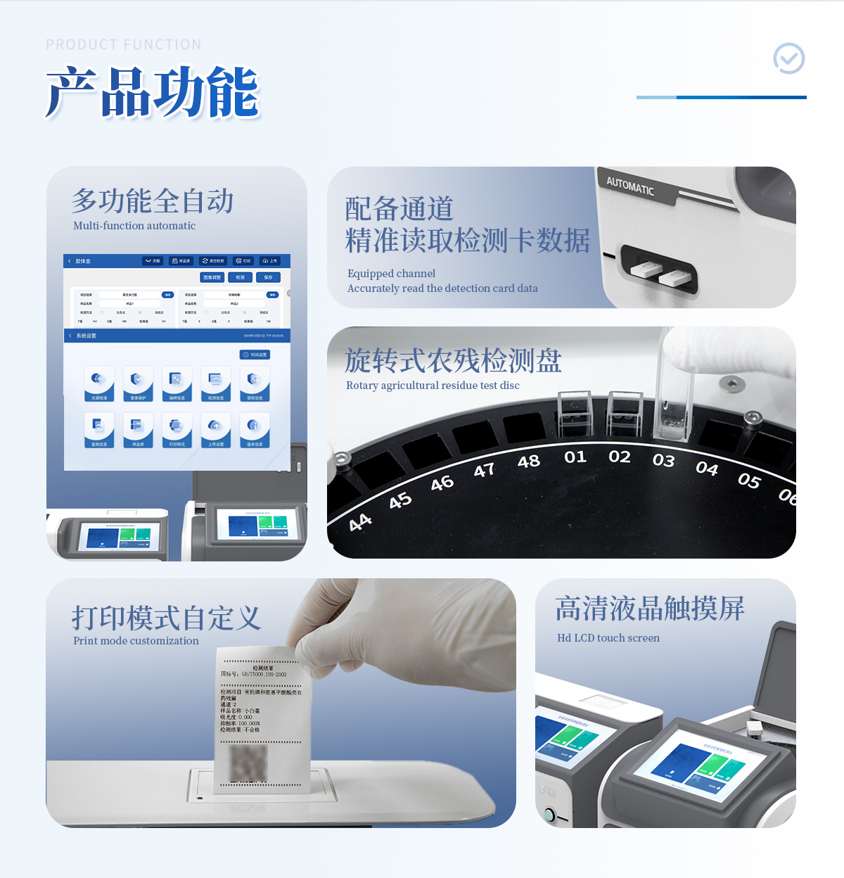 | 1. 試劑位置:3個 | 2. 農(nóng)殘檢測盤:旋轉(zhuǎn)24通道比色盤,可任意選擇檢測通道,自動對應(yīng)選擇通道。 | 3. 膠體金通道:2個,可讀取檢測卡結(jié)果,自動采集、處理分析,自動判斷檢測結(jié)果,并具備自動判空功能。 | 4.系統(tǒng)配置:10.1寸高清液晶觸摸屏,采用ARM Cortex?-A7,RK3288/4核處理器,運行內(nèi)存1GB。Android7.1.1 系統(tǒng)分辨率1280×800。 | 5.恒溫系統(tǒng):具有自動加溫溫控系統(tǒng),精準(zhǔn)恒溫37℃,精度±0.1℃。 | 6.添加系統(tǒng):儀器按照試劑要求自動、按時、按量加入試劑,并且自動對未正常放置的樣本或異常的樣本進行檢查并提示。 | 7.清洗功能:儀器具備回流及自動清洗管路功能,避免試劑污染。 | 8.混勻功能:設(shè)備具備自動混勻功能。 | 9.光源校準(zhǔn):設(shè)備可自動校準(zhǔn),確保檢測準(zhǔn)確度。 | 10.實時監(jiān)控:儀器測試過程中屏幕顯示運行狀態(tài),可實時查看。 | 11.數(shù)據(jù)存儲:內(nèi)部存儲16GB,可存儲500萬條數(shù)據(jù)。 | 12.樣品多選功能:設(shè)備具備樣品一鍵多選功能,選擇樣品自動匹配檢測通道。 | 13.項目預(yù)設(shè):可提前設(shè)置單個及多個相同或不相同的檢測任務(wù),可單次或者多次調(diào)取,減少檢測時間。 | 14.自定義打印系統(tǒng):內(nèi)置自定義打印系統(tǒng),可按需靈活設(shè)置開啟或關(guān)閉:產(chǎn)品合格證(國家農(nóng)業(yè)部標(biāo)準(zhǔn)),二維碼,抽樣信息、檢測信息,受檢信息等信息的打印。 | 15.A4版本報告打印功能:設(shè)備可自動生成A4版報告,A4報告帶二維碼,可掃描二維碼生成電子版,并可識別真?zhèn)巍? | 16.傳輸方式:儀器配備無線通信模塊: 4G(APN)通訊模塊、Wifi模塊,藍(lán)牙傳輸模塊,同時具有USB接口以及RJ45接口能以多種方式實現(xiàn)數(shù)據(jù)保存和數(shù)據(jù)傳輸功能,設(shè)備數(shù)據(jù)可以同步上傳至平臺。 | 17.系統(tǒng)17.數(shù)據(jù)監(jiān)管系統(tǒng):設(shè)備自帶監(jiān)管平臺,并可同步對接監(jiān)管平臺,數(shù)據(jù)可局域網(wǎng)和互聯(lián)網(wǎng)數(shù)據(jù)上傳,檢測結(jié)果可直接傳至食品安全監(jiān)管平臺。達到食品安全問題預(yù)估、預(yù)警。 | 18.系統(tǒng)遠(yuǎn)程更新功能:無需設(shè)備返廠,即可遠(yuǎn)程實時升級全新系統(tǒng),節(jié)省時間成本及避免運輸造成設(shè)備損。 |