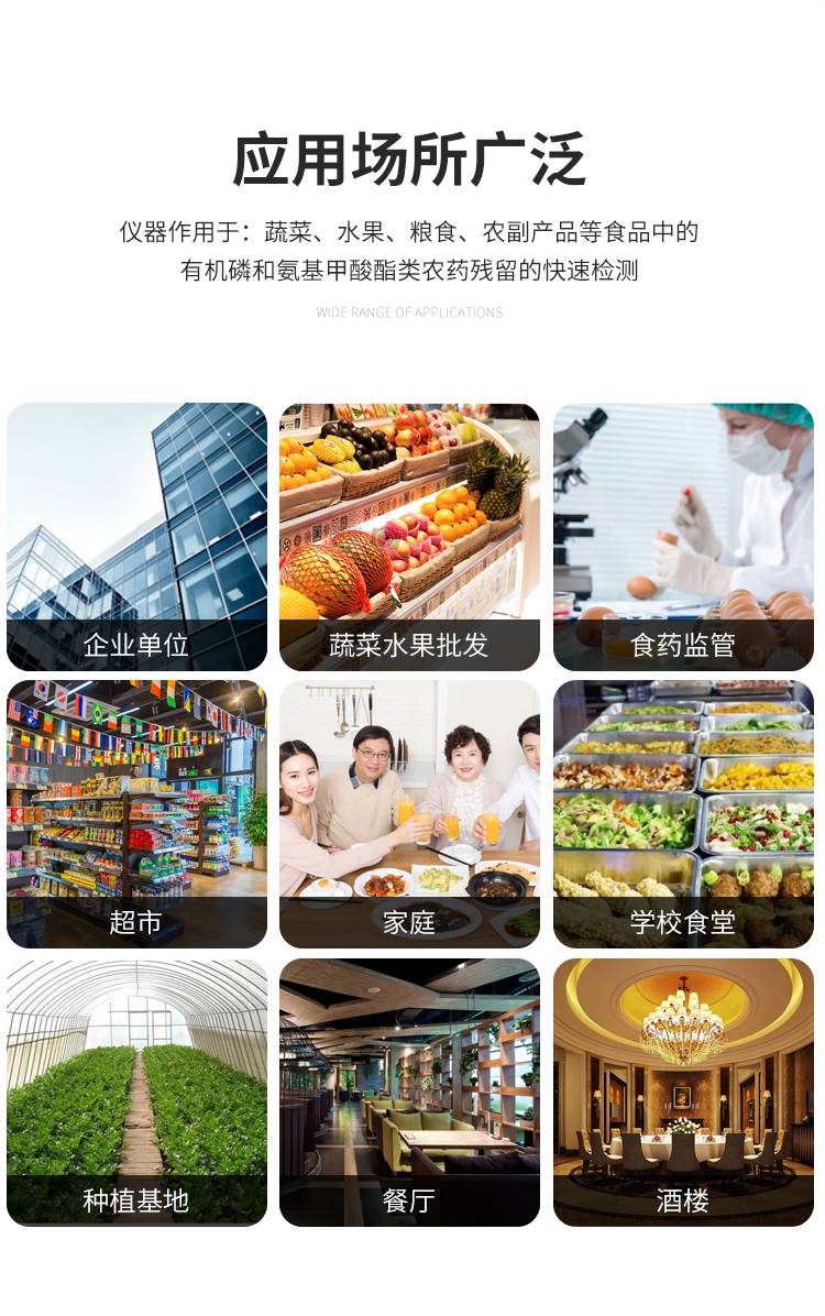 它可以廣泛應用于產品質量監督檢驗、衛生防疫、環境保護、工商管理、蔬菜批發市場、蔬菜生產基地、超市、商場、農藥殘留監測系統等部門的蔬菜和水果中的農藥殘留檢測。