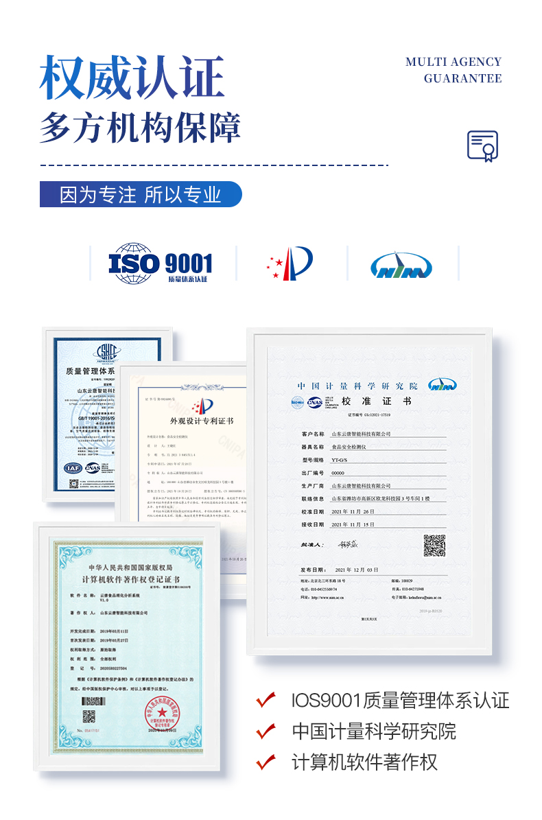 | 1、安卓智能操作系統,采用更加**和人性化操作,儀器具有網線連接、wifi聯網上傳、GPRS無線遠傳功能,快速上傳數據。 | 2、智能化程度高,儀器具有自檢功能:具有開機自檢和調零功能,具有自動檢測重復性功能。 | 3、新一代高速熱敏打印機,檢測完成可自動打印檢測報告和二維碼。 | 4、儀器帶有監管平臺,數據可局域網和互聯網數據上傳,檢測結果直接傳至食品安全監管平臺。進行區域食品安全監管及大數據分析處理與數據統計,檢測區域食品安全長短期動態,達到食品安全問題預估、預警 | 5、一體化主機,包含食品安全檢測模塊、多通道農藥殘留檢測模塊、膠體金免疫層析檢測模塊。 | 6、一體化便攜式快檢設備,滿足現場及流動檢測使用需求,能夠在同一軟件下實現所有檢測項目的檢測,并可通過同一窗口直觀顯示檢測結果。 | 7、膠體金模塊檢測方式:軌道式自動傳輸掃描,檢測完成后自動退出檢測卡。 | 8、CT線自動識別,無需手動調整。 | 9、儀器具有品類多種類樣品菜單庫,可靈活選擇檢測樣品,不同的檢測通道可同時檢測不同的樣品項目。 | 10、樣品處理簡單省力,整體操作快速、安全、便捷。 | 11、儀器具有自身保護功能,可設置用戶名及密碼,防止非工作人員操作等。 | 12、高靈敏度,高檢測精度,高重復性精度,掃描式高精度光學傳感器。 | 13、內置強大的數據庫,可在儀器上直接選擇樣品名稱、檢測指標、送檢單位等信息,也可在儀器上直接編輯錄入樣品名稱、檢測指標、送檢單位等信息并保存進樣品數據庫。 | 14、儀器具有重新校準、鎖定、恢復出廠設置功能。 | 15、結果判定線可修改,對照值標定值可保存,斷電不丟失數據。 | 16、兼容市場上所有的膠體金卡,使用耗材不受限制,極大增強用戶使用體驗。 |