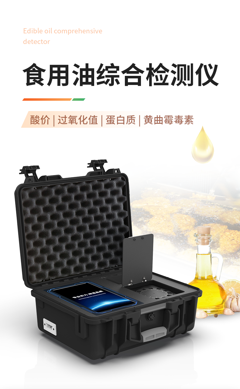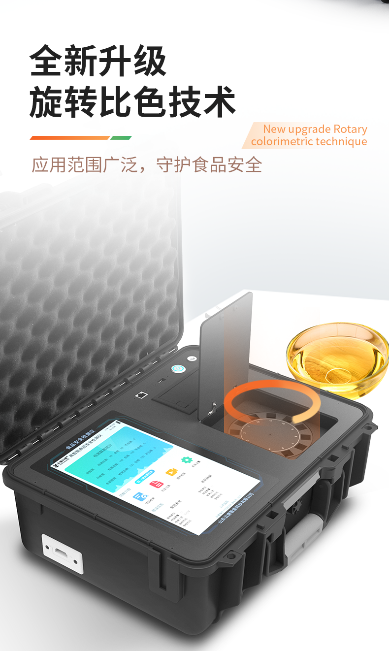 山東云唐智能科技有限公司生產的食用油綜合檢測儀為集成化食品安全快速檢測分析設備,采用箱式一體化設計,能夠快速檢測食用植物油、食用豬油、花生油、葵花油、米糠油、食品、肉制品中的酸價、過氧化值、黃曲霉毒素總量,M1,B1等含量;儀器預留其他項目檢測程序和端口,根據日后需求可進行遠程升級。