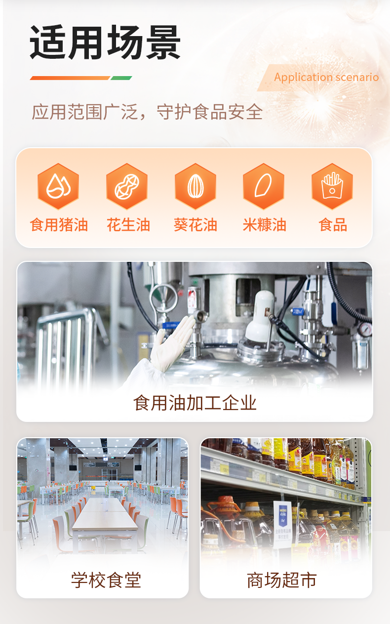 該食用油綜合檢測儀為集成化食品安全快速檢測分析設備,目前已于市場監(jiān)管局、食用油加工企業(yè)、學校食堂、衛(wèi)生部門、配送中心、商場超市等單位廣泛使用。。