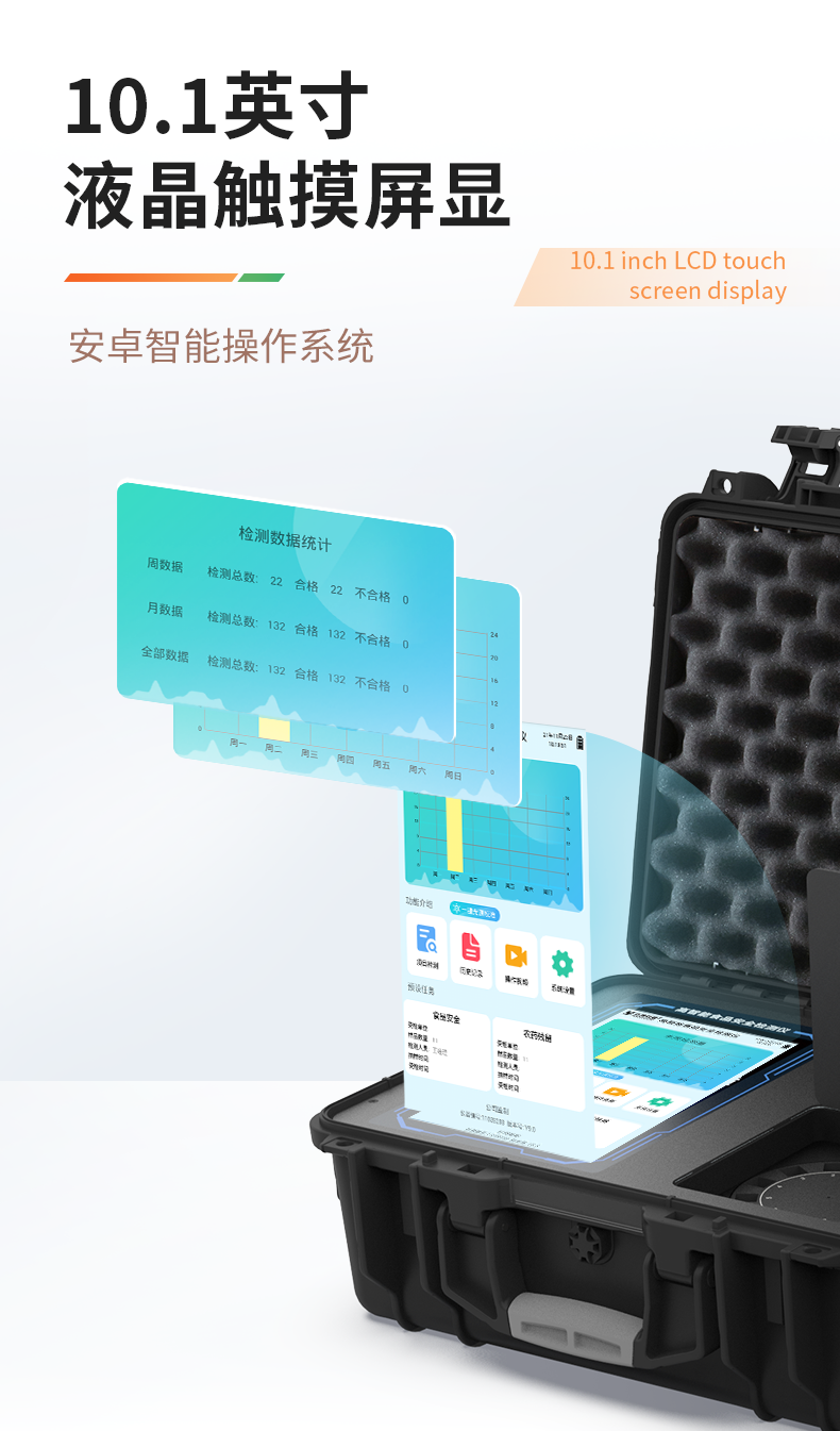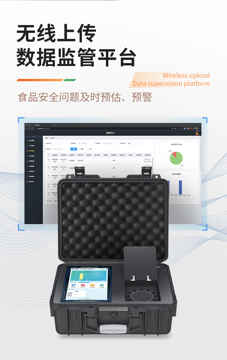 | 1、儀器采用手提一體化系統(tǒng)檢測技術,將分光光度模塊、膠體金檢測模塊、新型農殘檢測模塊、數字化管理模塊、無線通訊模塊高度集成于一體,支持檢測200種食品安全檢測項目,同時預留升級檢測方法。 | 2、儀器檢測模塊標準化、智能化,檢測項目可隨意自由組合。檢測箱體內置多個標準檢測單元,檢測模塊可以調整配置。 | 3、顯示屏幕:儀器采用10.1英寸豎向液晶觸摸屏顯,搭配運行安卓智能操作系統(tǒng),主控芯片采用ARM Cortex-A7,RK3288/4核處理器,主頻1.88Ghz,操作方便,性能更強。 | 4、檢測通道:≥12通道;采用精密旋轉比色池設計,使用同芯片同光源校準精度,解決不同光源之間的誤差值,更加準確**。(1-12通道間誤差0.1%,**號:**202022821055.2) | 5、儀器光源:高精度進口四波長冷光源,每個通道均配置 410、520、590、630nm 波長光源,標配**的光路切換裝置,**光路切換功能可實現(xiàn)64波長,并且所有檢測項目可實現(xiàn)所有通道同時檢測。 | 6、設備可一鍵校準,自動保存校準數據,自動對比校驗,得到精準光源,采用Android SP存儲數據,光源數據永不丟失,方便每一次使用。 | 7、通訊接口:配備無線通信模塊、4G(APN)通訊模塊、藍牙傳輸,同時具有雙USB接口以及RJ45網線接口,可以多方式實現(xiàn)數據保存及數據傳輸。 | 8、存儲方式:支持U盤存儲,標準USB接口,免驅動安裝。檢測結果存儲容量20萬條以上,可生成Excel表格進行拷貝,并具有登錄保護功能。 | 9、智能化操作系統(tǒng): | 9.1、操作系統(tǒng):儀器可在同一檢測界面自動對應相關檢測通道,一次性選擇1-12個樣品名稱,無需退出界面,節(jié)省操作時間。并可以對每個通道屬性和樣品信息單獨進行編輯,例如送檢單位、人員,檢測人員等,打印時勾選打印顯示。 | 9.2、數據集成系統(tǒng):設備首頁自動匯總分析檢測數據,包含:周檢測數據、月檢測數據,全部檢測總數量,包含檢測總數,合格數,不合格數,以及相關柱形分析圖,各項檢測數據一目了然,無需電腦查詢,更加快捷直觀。 | 9.3、數據庫系統(tǒng):十幾項數據庫分類管理儀器:包含項目類型、項目數據、檢測數據、歷史記錄、國標信息、曲線信息、采樣信息、檢測信息、受檢信息、復核信息、圖表信息、光源校準信息、打印樣式信息、樣品庫信息等等,數據庫之間互相協(xié)調聯(lián)動保證數據的真實完整性。同時產品數據庫以及歷史檢測記錄支持一鍵檢索功能。 | 9.4、限量規(guī)判系統(tǒng):具有限量查詢、添加物質合規(guī)判定系統(tǒng)。檢測出結果后,系統(tǒng)自動調用系統(tǒng)數據庫中相關國標進行比對判定,客觀顯示判定結果是否合格。 | 9.5、項目預設系統(tǒng):儀器具有任務預設模塊,一鍵提前預設,給出方便快捷的新檢測方案,每一個任務分別可以設置不同的樣品、批次、編號、來源、備注、抽樣信息、檢測信息、受檢信息、復核信息等更多信息。樣品送檢時一鍵調取保存信息,并可多次調取,大大提高檢測效率。 | 9.6、數據監(jiān)管系統(tǒng):同步對接監(jiān)管平臺,數據可局域網和互聯(lián)網數據上傳,檢測結果可直接傳至食品安全監(jiān)管平臺。進行區(qū)域食品安全監(jiān)管及大數據分析處理與數據統(tǒng)計,監(jiān)測區(qū)域食品安全長短期動態(tài)及問題預估、預警。 | 9.7.1、全新打印系統(tǒng):內置全新打印機,新創(chuàng)自定義打印方式,可按需靈活勾選控制:產品合格證(國家農業(yè)部標準要求),二維碼,抽樣信息、檢測信息,受檢信息、復核信息、抽樣日期、檢測日期等信息的打印。 | 9.7.2、A4紙版本報告打印功能(可選配):設備擁有兩種結果展示方式,可以自動生成A4打印模板和小票打印模板兩種樣式,可通過WiFi及網線等方式鏈接外置打印機可進行打印。 | 10、供電模式:儀器交直流兩用,直流12V供電,可連接車載電源,配6ah大容量充電鋰電池,電量可實時顯示,方便戶外流動測試。 | 11、膠體金檢測模塊:采用單通道CMOS成像處理技術及膠體金免疫層析技術,可讀取膠體金卡數據,自動采集、處理分析,將檢測結果顯示,并可根據參考限值自動判斷檢測結果,可檢測常見的獸藥殘留、生物毒素、抗生素、違禁添加物等。 | 11.1、探測技術:CMOS成像探測; | 11.2、檢測通道:1個通道; | 11.3、檢測方式:消線法和比色法; | 11.4、顯示模式:陰性或陽性; | 11.5、曲線形式:軌道式掃描方式,顯示金標卡圖像,實時生成、識別CT曲線圖,無需手動調整,完成檢測后自動退出檢測卡。兼容市場上其他金標卡,使用耗材不受限制。 | 12、儀器具備遠程升級功能,可定向分客戶分儀器更新,開機后自動更新,并可持續(xù)性免費更新系統(tǒng)版本,無需像傳統(tǒng)產品返廠更新,節(jié)省時間及人力成本并避免了物流運輸返廠升級導致設備損壞的潛在風險。 |