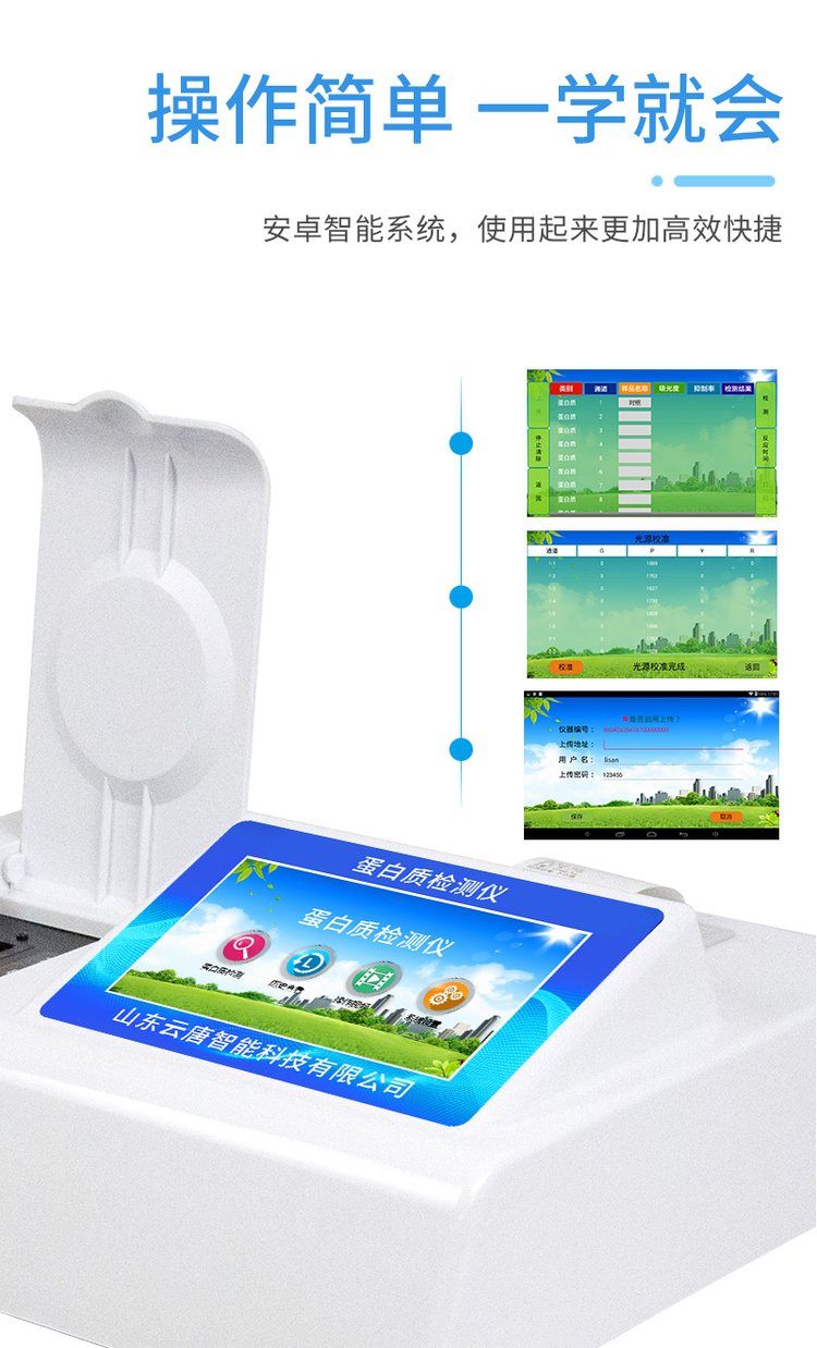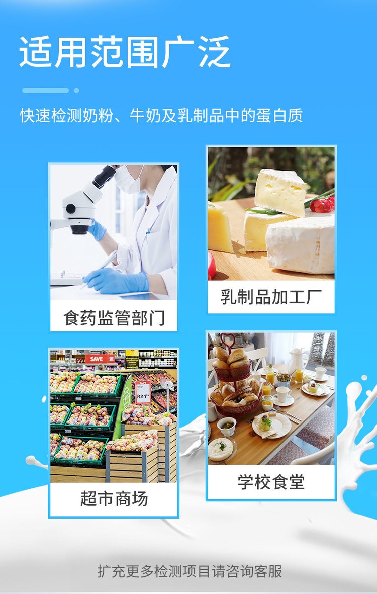檢測項(xiàng)目:可快速檢測奶粉、牛奶及乳制品中的蛋白質(zhì),儀器預(yù)留其他項(xiàng)目檢測程序和端口,根據(jù)日后需求可方便的自主增加檢測項(xiàng)目。