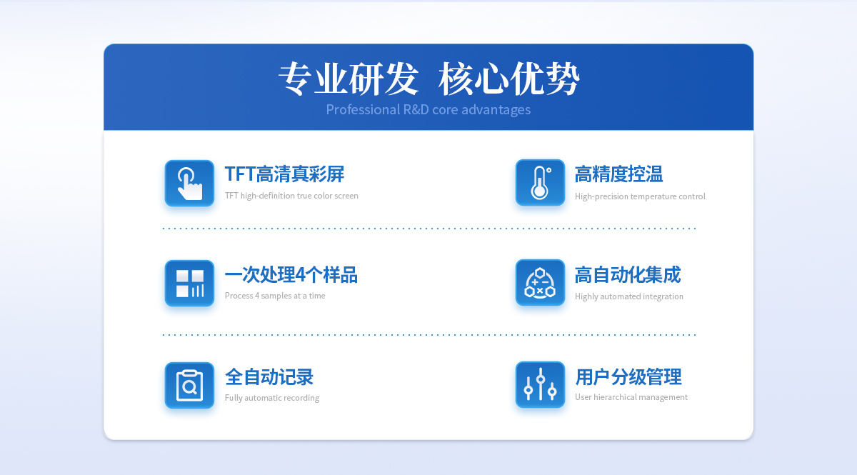 | 升溫一次*多放置4個樣品,與傳統測量方法相比工作效率提高4倍,且4組數據分別記錄實現對歷史數據的追溯,符合FDA 21CFR11確保出具報告的可信度。 |