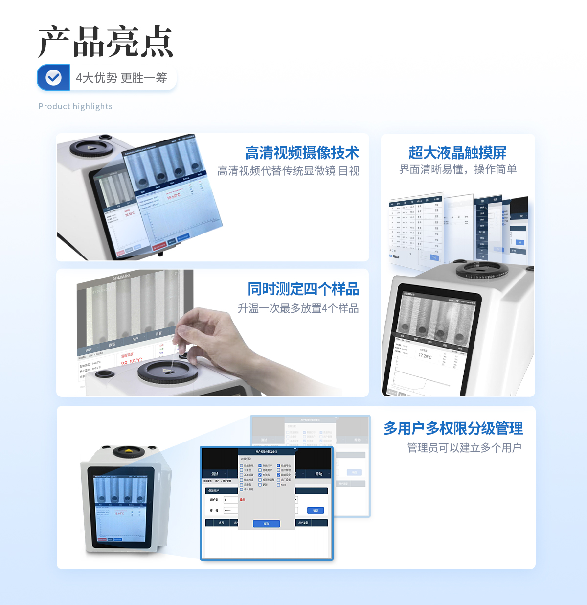 | 1、自動化集成,實現一鍵測定功能; | 2、一次處理4個樣品; | 3、高清視頻代替傳統顯微鏡 目視高; | 4、全自動記錄熔程,初熔,終熔; | 5、可通過打印機直接打印數據。 |