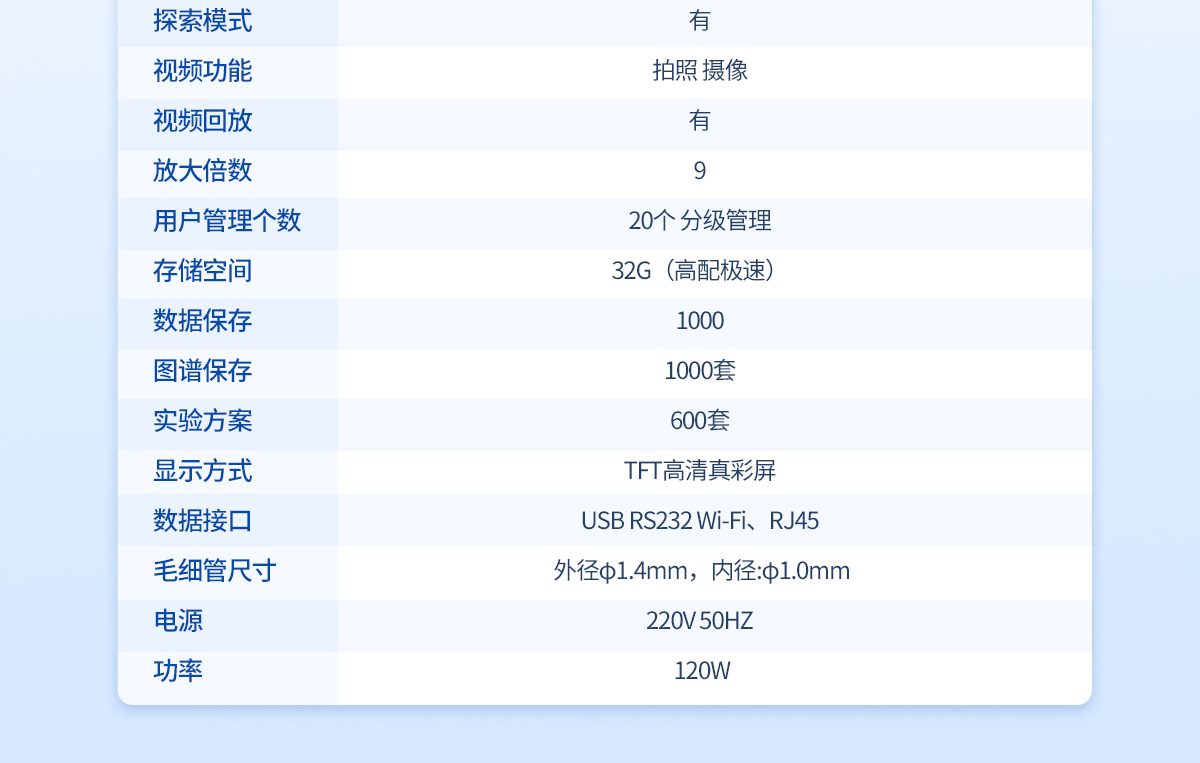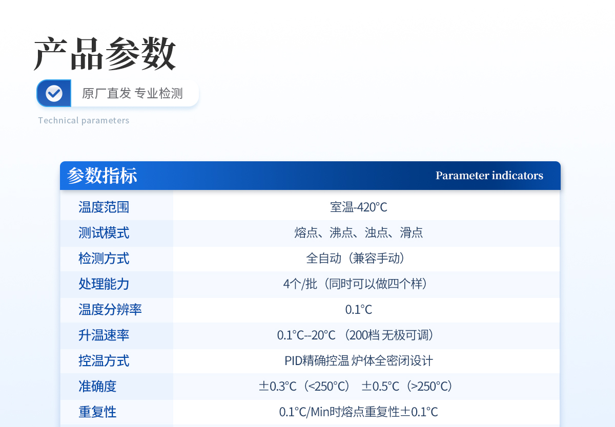 | 溫度范圍: 室溫-420℃ | 檢測方式: 全自動(兼容手動) | 處理能力: 4個/批(同時可以做四個樣) | 溫度分辨率:0.01℃ | 控溫方式: PID**控溫 爐體全密閉設計 | 準確度: ±0.2℃(<200℃),±0.4℃(>200℃) | 加熱方式:電熱塊空氣加熱法 | 升溫分辨率:≤0.1℃ | 升溫速率::0.1℃/Min--20℃/Min | 準確度:±0.2℃(<200℃)、±0.4℃(>200℃) | 重復性: 0.1℃/Min時熔點重復性±0.1℃ | 探索模式: 有 | 視頻功能: 拍照 攝像 | 視頻回放: 有 | 放大倍數: 10 | 用戶管理個數:500個以上,分四級管理 | 數據保存: 800套 | 實驗方案存儲:100套 | 打 印 機: 通用型 | 存儲空間: 128G(高配極速) | 顯示方式: 10寸TFT高清真彩屏 | 數據接口: USB RS232 Wi-Fi、RJ45 | 毛細管尺寸: 外徑φ1.4mm,內徑:φ1.0m | 電源:220V 50HZ 功率:120W |
