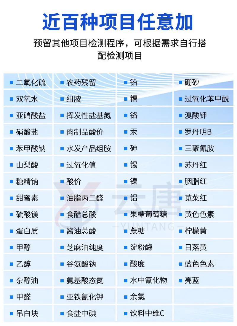 檢測項目:可快速檢測各類食品中的雙氧水的含量,儀器預留其他項目檢測程序和端口,根據(jù)日后需求可方便的自主增加檢測項目。日后可升級為檢測,水產(chǎn)品,肉制品,面制品的綜合類型儀器。