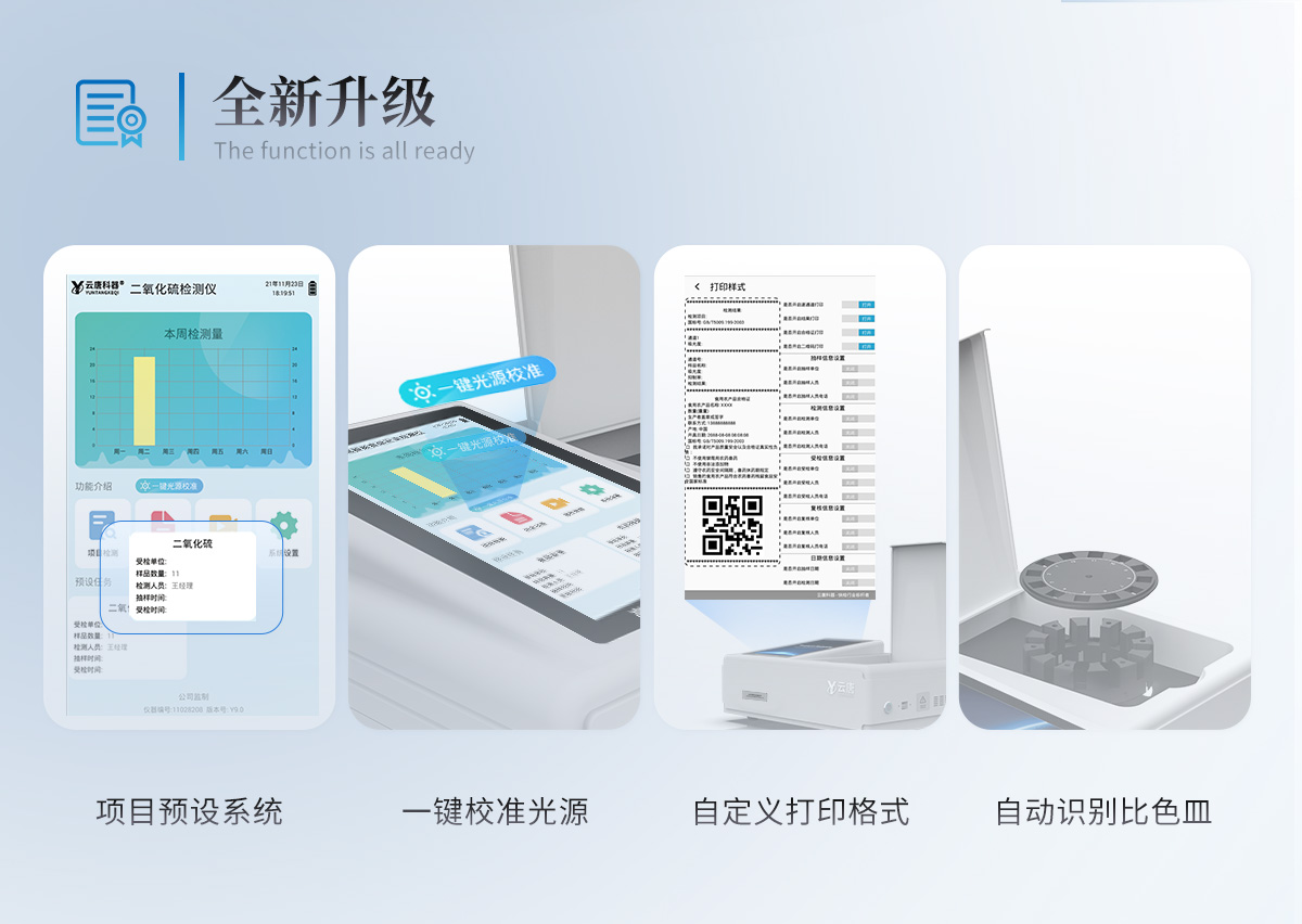 | 儀器采用臺式一體化系統檢測技術,將分光光度模塊、新型農殘檢測模塊、數字化管理模塊、無線通訊模塊高度集成于一體,支持檢測200種食品安全檢測項目,同時預留升級檢測方法。 | 儀器檢測模塊標準化、智能化,可隨意自由組合。檢測箱體內置多個標準檢測單元,檢測模塊可以調整配置。 | 儀器采用全新安卓智能系統,主控芯片采用 ARM Cortex-A7,RK3288/4核處理器,10.1寸高清液晶觸摸豎屏,更加**的UI交互界面,運轉快捷;儀器配備無線通信模塊: 4G(APN)通訊模塊、Wifi模塊,藍牙傳輸,同時具有雙USB接口以及RJ45接口能以多種方式實現數據保存和數據傳輸功能。 | 創新檢測模式: | ★檢測通道:≥12通道;采用精密旋轉比色池設計,使用同芯片同光源校準精度,解決不同光源之間的誤差值。1-12通道間誤差0.1%。(**號:**202022821055.2) | ★儀器具有自動識別比色皿檢測功能,即:將樣品比色皿放入儀器后,點擊樣品檢測,儀器自動識別比色皿進行通道檢測。 | 進口高精光源: | 高精度進口四波長冷光源,通道配置 410、520、590、630nm 波長光源,一個光源芯片驅動一個光源,誤差極小,每臺設備單獨**校準光源,**比對,同時參照四種不同波段光源全方位覆蓋市面上99%的農殘食品項目檢測。 | 智能化操作系統: | 便捷操作系統:設備檢測時可在同一檢測界面自動對應相關檢測通道一次性選擇1-12個樣品名稱,無須退出界面,節省操作時間。 | 數據集成系統:設備首頁自動統計檢測數據包含:周檢測數據、月檢測數據,全部檢測總數量,均包含檢測總數,合格數,不合格數,以及相關柱形分析圖,對各項檢測數據清晰掌握,無需電腦查詢,更加快捷直觀。 | 項目預設系統:支持添加單個及多個相同或不相同的任務預設,一鍵快速調取,每一個任務分別可以設置不同的樣品、批次、編號、來源、備注、抽樣信息、檢測信息、受檢信息、復核信息等更多信息。無縫鏈接平臺和APP實時查看下發任務。 | 數據監管系統:同步對接監管平臺,數據可局域網和互聯網數據上傳,檢測結果可選擇直接傳至食品安全監管平臺。集成OSS輸出存儲服務、區分設備定向管理應用,進行區域食品安全監管及大數據分析處理與數據統計,檢測區域食品安全長短期動態,達到食品安全問題預估、預警。 | 自定義打印系統:內置全新打印系統,新創自定義打印方式,可按需靈活設置開啟或關閉:產品合格證(國家農業部標準要求),二維碼,抽樣信息、檢測信息,受檢信息、復核信息、抽樣日期、檢測日期等信息的打印。 | 系統遠程更新功能:可定向分客戶分儀器更新系統,按照不同客戶后期實際需求添加項目,無需機器返廠,即可遠程實時升級全新系統,節省時間成本及避免運輸造成設備損壞。 | 儀器主機采用一體化防水、抗壓、防撞擊、防腐蝕箱體設計,同時配備交直流供電,可連接車載電源,可選配大容量充電鋰電池,滿足現場野外檢測需求。 | 安全證書,放心保障:儀器具有中國計量科學研究院校準證書,權威認證。 |