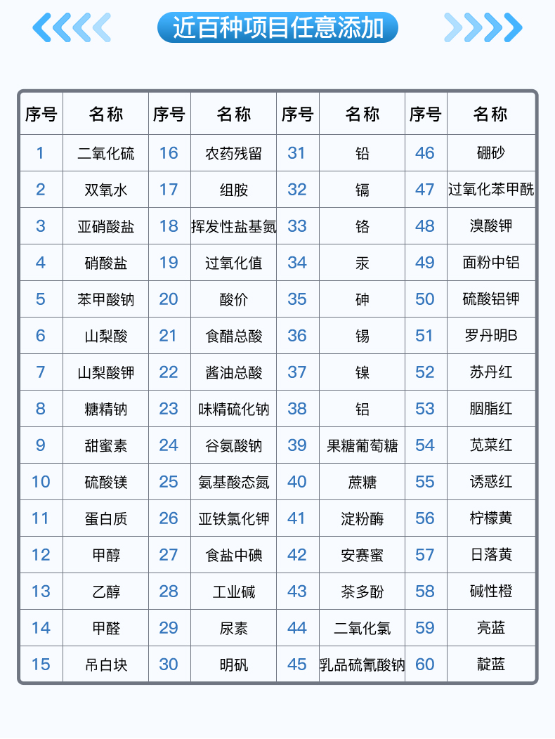 可快速檢測各類食品中的亞硝酸鹽、二氧化硫、甲醛、吊白塊、雙氧水、硼砂、農藥殘留、乳及乳制品中蛋白質、硝酸鹽、重金屬鉛的含量,儀器預留其他項目檢測程序和端口,根據日后需求可方便的自主增加檢測項目。