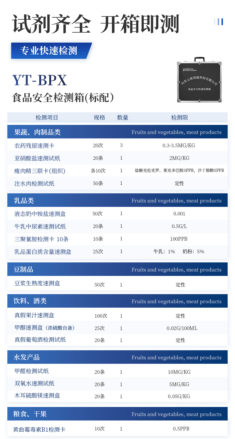 | 肉制品色素速測盒 | 50次 | 盒 | 1 | 25mg/kg | 0-100mg/kg | ||