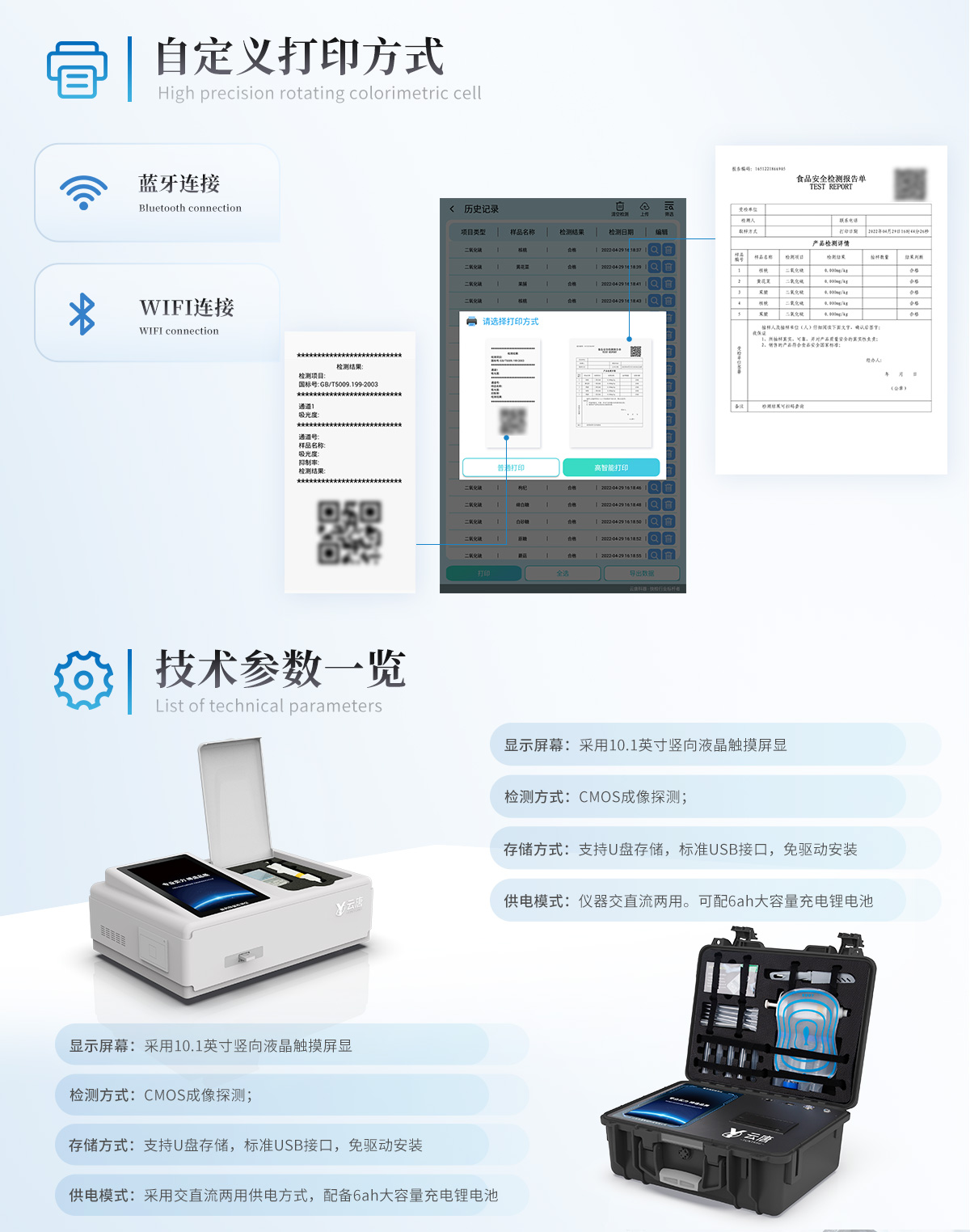 | 1、儀器采用10.1英寸液晶觸摸屏顯,搭配運行安卓智能操作系統,主控芯片采用ARM Cortex-A7,RK3288/4核處理器,主頻1.88Ghz,運轉速度更快速,性能更強。 | 2、儀器功能包括:膠體金檢測模塊、數字化管理模塊、無線通訊模塊等,可以滿足同一軟件下實現所有檢測項目的檢測,并在同一窗口展示檢測結果。 | 3.一體化便攜式快檢設備,采用交直流兩用供電方式,可連接車載電源,配備6ah大容量充電鋰電池,可以滿足現場及流動檢測使用的需求。儀器尺寸:43×35×20cm, 主機凈重:5.1kg | 4、系統自帶數據集成模塊,設備首頁自動統計檢測數據包含:周檢測數據、月檢測數據,全部檢測總數量,均包含檢測總數,合格數,不合格數,以及相關柱形分析圖,對各項檢測數據清晰掌握,無需電腦查詢,更加快捷直觀。 | 5、儀器具有任務預設模塊,可在樣品送檢前提前預設樣品名稱、檢測指標、送檢單位等信息,樣品送檢時一鍵調取保存信息,檢測更加方便快捷。 | 6、膠體金檢測模塊: | 軌道式自動傳輸掃描方式,可實時顯示金標卡實時圖像,系統自動分析并呈現出CT曲線圖,CT線自動識別,無需手動調整,完成檢測后自動退出檢測卡。 | 結果判定線可修改,對照值標定值可保存,斷電不丟失數據。 | 兼容市場上其他膠體金卡,使用耗材不受限制,極大增強用戶使用體驗。 | 7、儀器檢測系統擁有龐大數據庫,并且構建了完善的檢索、修訂功能。食品庫涵蓋多種樣品名稱,可按需添加或刪除、編輯樣品名稱;產品數據庫以及歷史檢測記錄支持一鍵檢索功能。 | 8、系統打印自定義化,打印格式多樣化,產品合格證(國家標準要求),二維碼,抽樣信息、檢測信息,受檢信息、復核信息、抽樣日期、檢測日期等信息結果,可按需求自行設置打印內容。 | 9、A4紙版本報告打印功能(可選配):設備擁有兩種結果展示方式,可以自動生成A4打印模板和小票打印模板兩種樣式,可通過WiFi及網線等方式鏈接外置打印機可進行打印 | 10、儀器具有 wifi 聯網上傳、RJ45網線連接功能,可以快速上傳數據。同步對接監管平臺,數據可局域網和互聯網數據上傳,檢測結果直接傳至食品安全監管平臺。進行區域食品安全監管及大數據分析處理與數據統計,檢測區域食品安全長短期動態,達到食品安全問題預估、預警。 | 11、設備支持U盤存儲,標準USB接口,免驅動安裝。檢測結果存儲容量20萬條以上,可生成Excel表格,進行一鍵拷貝,并具有登錄保護功能,可設置用戶名及密碼,規范不同人員操作權限,防止非工作人員操作,并且可以進行重新校準、鎖定、恢復出廠設置功能。儀器固件可升級,后期檢測項目可擴充。 | 12、儀器具備遠程升級功能,可定向分客戶分儀器更新,開機后自動更新,并可持續性免費更新系統版本,無需像傳統產品返廠更新,節省時間及人力成本并避免了物流運輸返廠升級導致設備損壞的潛在風險。 |