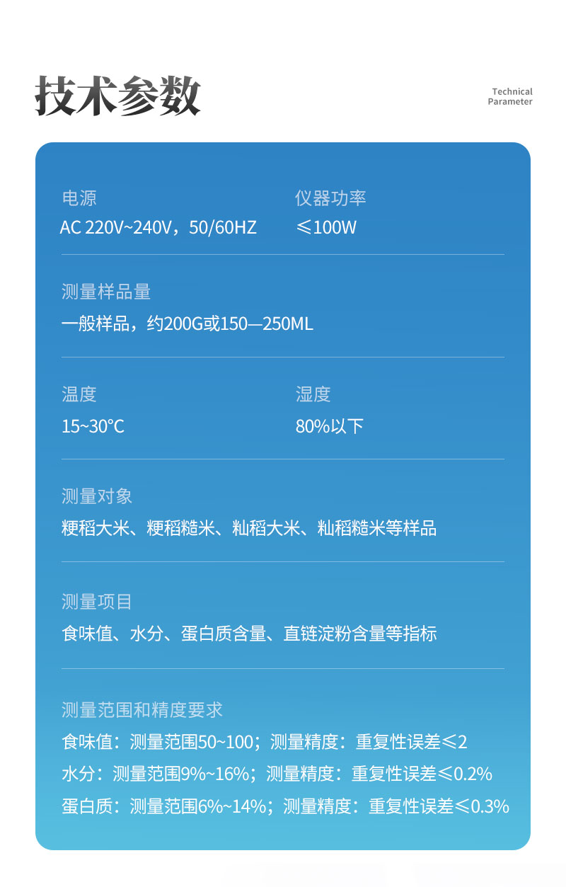 食味值:測量范圍50~100;測量精度:重復性誤差≤2;