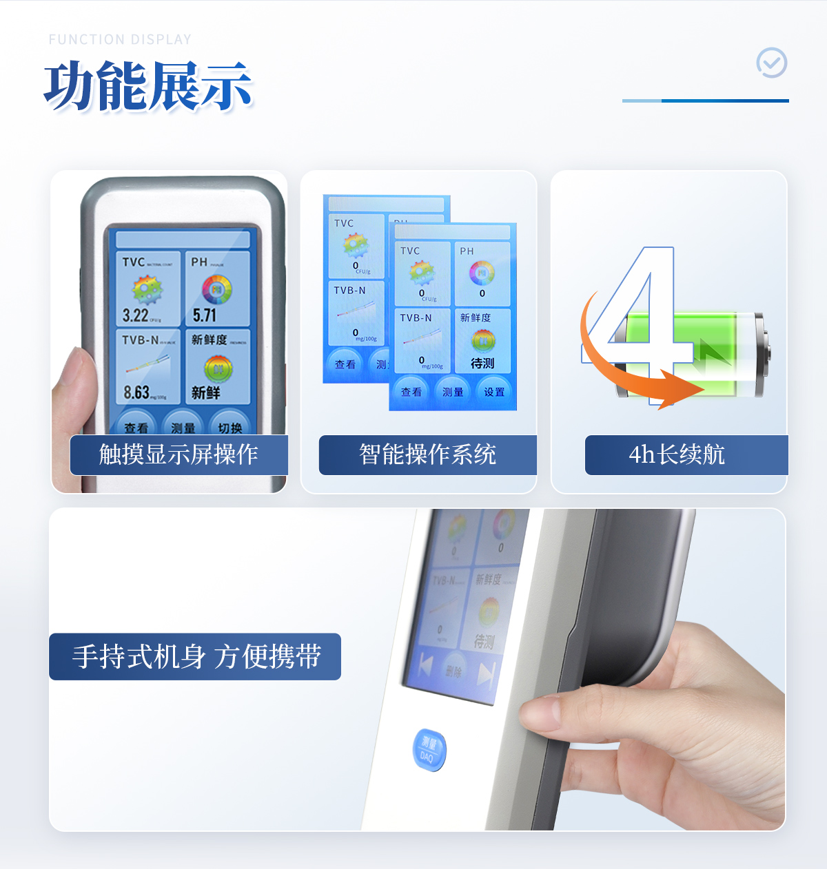 簡(jiǎn)介:掌上式生鮮肉新鮮度分析儀YT-PA 產(chǎn)品介紹聯(lián)合中國(guó)農(nóng)業(yè)大學(xué)彭彥昆教授團(tuán)隊(duì)研發(fā)的掌上式生鮮肉新鮮度分析儀,可用于檢測(cè)生鮮肉的TVC、pH、TVB-N、新鮮度、L*、A*、B*等評(píng)價(jià)指標(biāo)。Palmarter具有體積小、便 于攜帶、性?xún)r(jià)比高等特點(diǎn),其應(yīng)用場(chǎng)景包括但不限于肉儲(chǔ)運(yùn)企業(yè)、肉品品質(zhì)監(jiān)管部門(mén)、飯店、超市、菜場(chǎng)、家庭等。