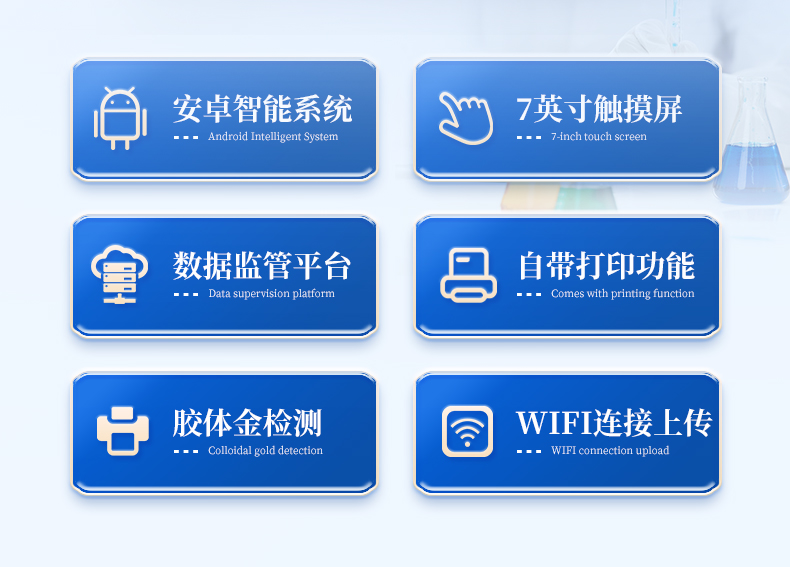 | 安卓智能操作系統,采用更加**UI交互界面,儀器具有wifi聯網上傳、4G聯網傳輸、GPRS無線遠傳、網線連接功能,快速批量上傳數據。 | 智能化程度高,儀器具有自檢功能:具有開機自檢和調零功能,具有自動檢測重復性功能。 | 新一代高速熱敏打印機,檢測完成可自動打印檢測報告和二維碼。 | 儀器帶有監管平臺,數據可局域網和互聯網數據上傳,檢測結果直接傳至食品安全監管平臺。進行區域食品安全監管及大數據分析處理與數據統計,檢測區域食品安全長短期動態,達到食品安全問題預估、預警 | 一體化便攜式快檢設備,滿足現場及流動檢測使用需求,能夠在同一軟件下實現所有檢測項目的檢測,并可通過同一窗口直觀顯示檢測結果。 | 膠體金模塊檢測方式:軌道式自動傳輸掃描,檢測完成后自動退出檢測卡。 | 一體化主機,包含食品安全檢測模塊、多通道農藥殘留檢測模塊、膠體金免疫層析檢測模塊。 | CT線自動識別,無需手動調整。 | 儀器具有品類多種類樣品菜單庫,可靈活選擇檢測樣品,不同的檢測通道可同時檢測不同的樣品項目。。 | 樣品處理簡單省力,整體操作快速、安全、便捷。 | 儀器具有自身保護功能,可設置用戶名及密碼,防止非工作人員操作等。 | 高靈敏度,高檢測精度,高重復性精度,掃描式高精度光學傳感器。 | 儀器具有重新校準、鎖定、恢復出廠設置功能。 | 內置強大的數據庫,可在儀器上直接選擇樣品名稱、檢測指標、送檢單位等信息,也可在儀器上直接編輯錄入樣品名稱、檢測指標、送檢單位等信息并保存進樣品數據庫。 | 儀器具有重新校準、鎖定、恢復出廠設置功能。 | 結果判定線可修改,對照值標定值可保存,斷電不丟失數據。 | 兼容市場上所有的膠體金卡,使用耗材不受限制,極大增強用戶使用體驗。 |