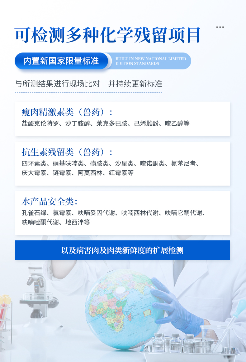 | 瘦肉精激素類(獸藥):鹽酸克倫特羅、沙丁胺醇、萊克多巴胺、己烯雌酚、喹乙醇等 | 抗生素殘留類(獸藥):四環素類、硝基呋喃類、磺胺類、沙星類、喹諾酮類、慶大霉素、鏈霉素、阿莫西林、紅霉素等 | 水產品安全類:孔雀石綠、氯霉素、呋喃妥因代謝、呋喃西林代謝、呋喃它酮代謝、呋喃唑酮代謝等 | 以及病害肉及肉類新鮮度的擴展檢測。 |