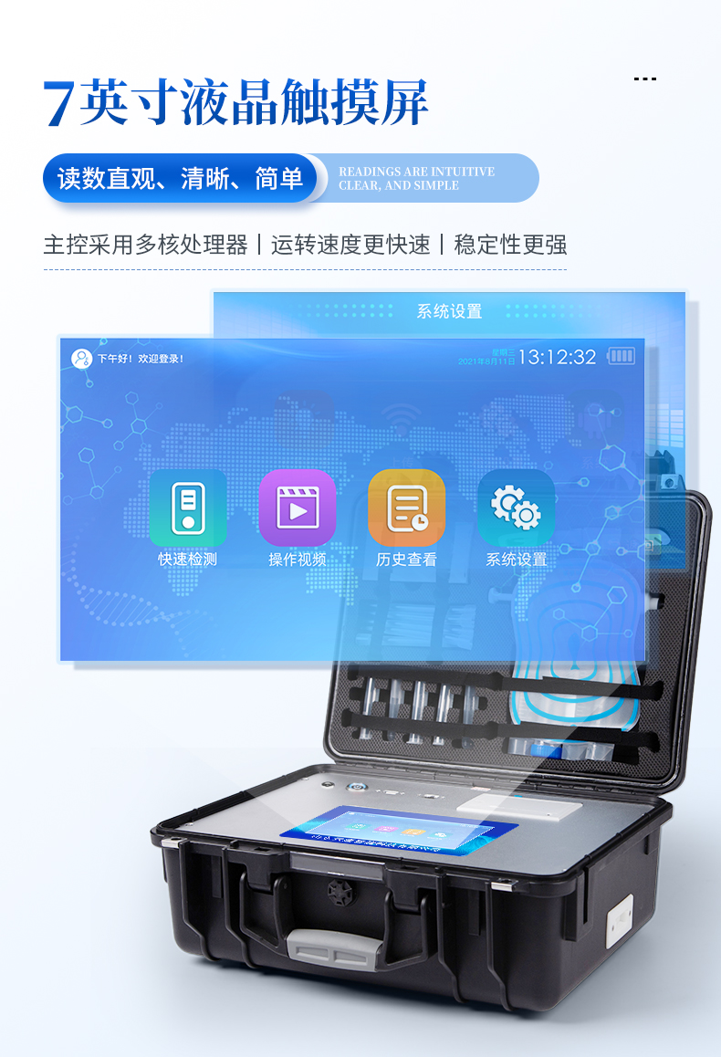 | 主控芯片采用ARM Cortex-A7,RK3288/4核處理器,主頻1.88Ghz,運轉速度更快速,穩定性更強。 | 顯示方式:7英寸液晶觸摸屏顯示,人性化中文操作界面,讀數直觀、簡單。 | 交直流兩用,直流12V供電,可連接車載電源,可配6ah大容量充電鋰電池,方便戶外流動測試。 | 四波長冷光源,每個通道均配置410、520、590、630nm波長光源,標配**的光路切換裝置,**光路切換功能可實現*多64波長,并且所有檢測項目可實現所有通道同時檢測。 | 光源亮度自動調節與校準 | 智能恒流穩壓,光強自動校準,長時間連續工作光源無溫漂現象。 | 內置新國家限量標準,與所測結果進行現場比對,并持續更新標準。 | 不間斷進樣,連續檢測 | 樣本編號自動累加。 | 數據無線上傳平臺,并可從平臺導出為Excel表格。 | 檢測結果存儲容量20萬條 | 同時支持U盤拷貝,標準USB接口,免驅動插拔。 | 檢測項目可擴充,固件可升級 | 儀器尺寸:43×35×20cm, 主機凈重:5.2kg |