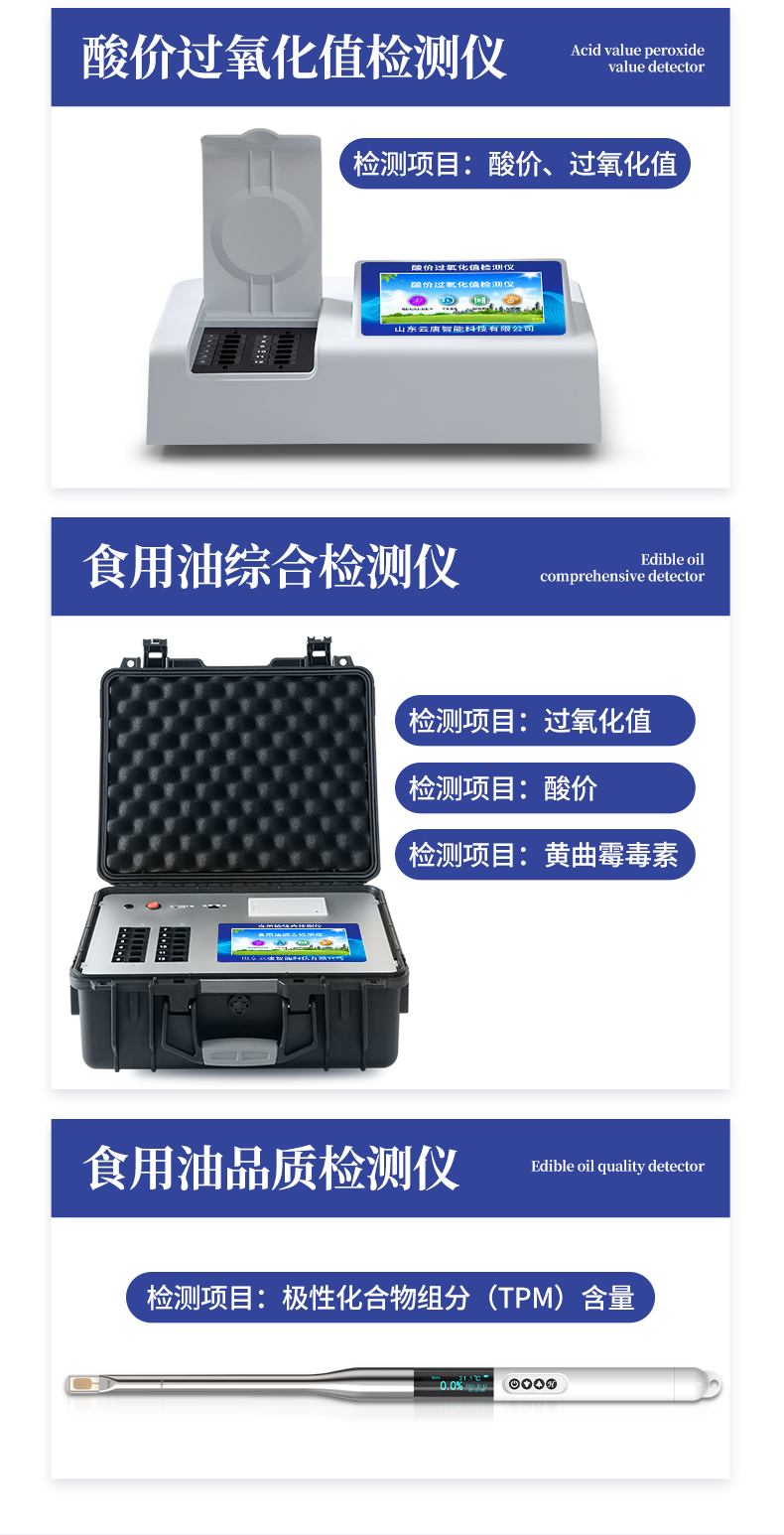 食用油過氧化值檢測儀為集成化油品快速檢測分析設備,能夠快速檢測食用植物油、食用豬油、花生油、葵花油、米糠油、食品、肉制品中的過氧化值含量;通過檢測可確定植物油是否符合國家標準或是否為劣質油、地溝油等。儀器預留其他項目檢測程序和端口,根據日后需求可方便的自主增加檢測項目。日后可升級為檢測水產品、面制品的綜合類型儀器。